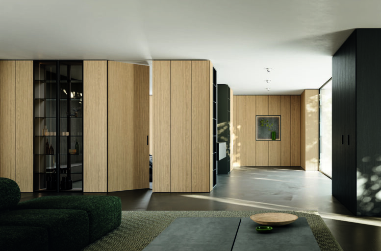 La boiserie, studiata per rivestire pareti, angoli e pilastri con precisione millimetrica, si integra perfettamente con Freedhome, il grande contenimento Caccaro, permettendogli di diventare bifacciale e ampliando le possibilità progettuali.