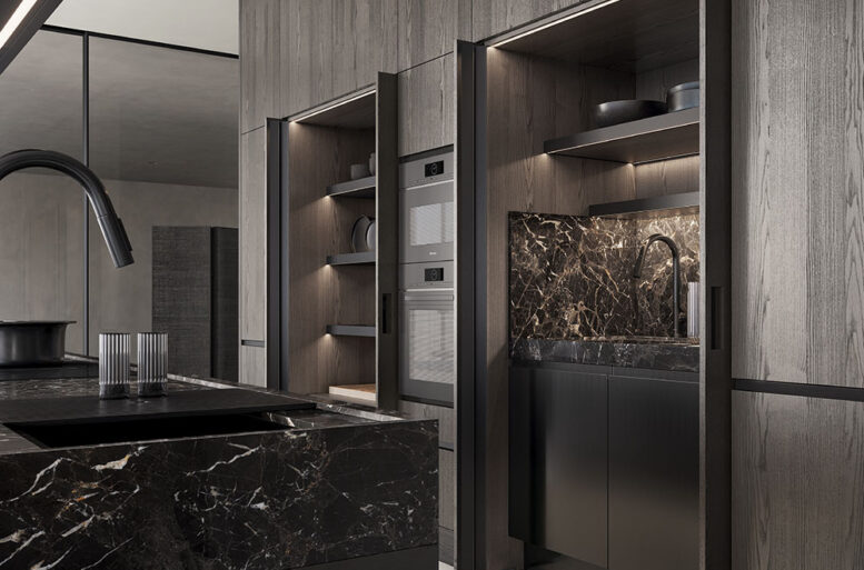Il vano New Pocket System, attrezzato a credenza, ha anta in rovere grigio NTF verticale e maniglia New Pocket PVD nero. All’interno, cestone in legno e ripiani con telaio in alluminio verniciato nero, accessori in rovere fiammato finitura moka, luce LED integrata 3000K.