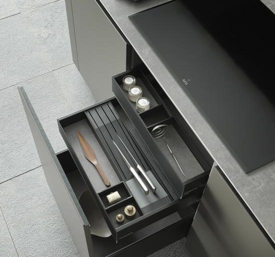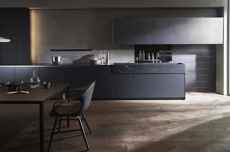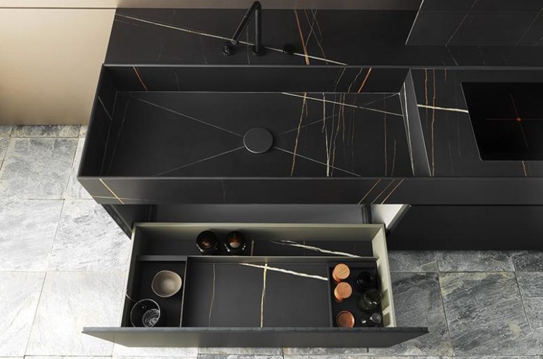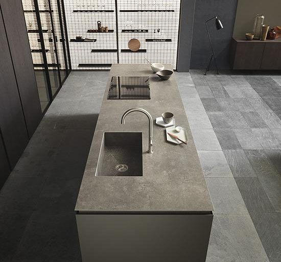 Modulnova presenta Skill: un progetto caratterizzato dalle linee pulite che consentono alla nuova cucina Modulnova di adattarsi perfettamente ad ogni esigenza, senza perdere la propria originalità. La personalizzazione è infatti al centro del progetto Skill che grazie a materiali innovativi e a dettagli ricercati può offrire soluzioni uniche e funzionali. Il piano di lavoro, la boiserie e il lavello sono in gres sahara noir azalai, un materiale elegante e resistente, messo in risalto dall’abbinamento con le ante e con gli altri mobili della cucina.