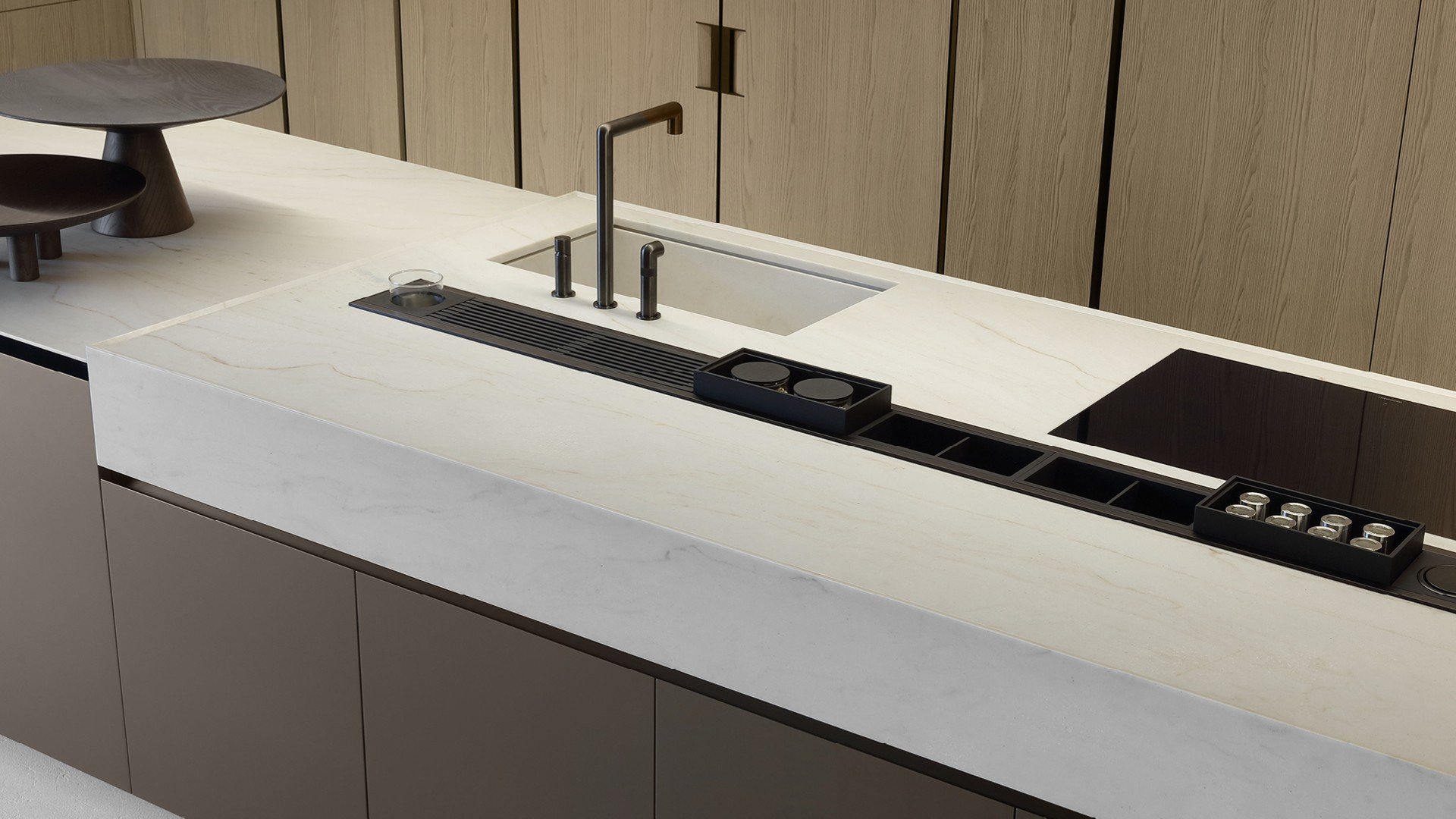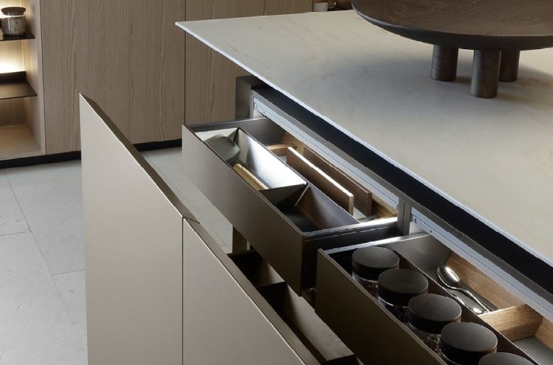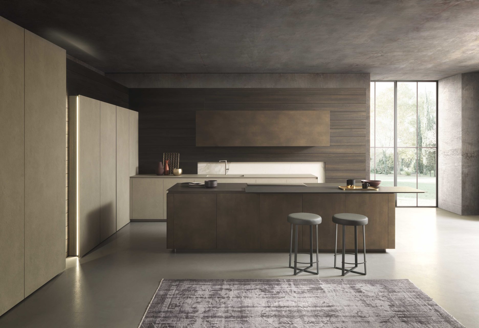 Il restyling di Artex Pro si rivela primariamente a partire dal piano cucina. Il nuovo sviluppo del top con una inedita inclinazione del bordo crea suggestivi giochi di luce e profondità, accentuati dalla presenza delle gole – elemento distintivo del sistema – che contribuisce a un effetto di estrema leggerezza visiva. L’introduzione di una nuova altezza del piano (da 18 cm) dona al progetto una presenza più scultorea, in particolare nella composizione a isola.  È proprio l’isola a ospitare un’ulteriore innovazione: il piano snack a sbalzo, che conferisce dinamismo al volume e continuità visiva tra la zona operativa e quella conviviale.