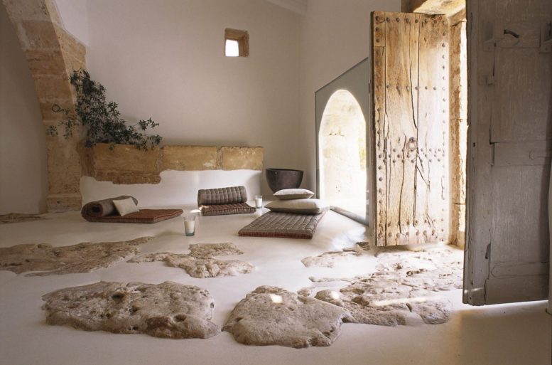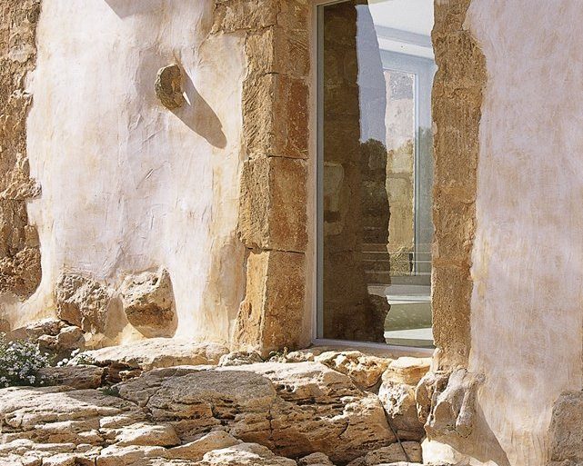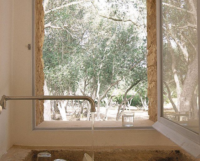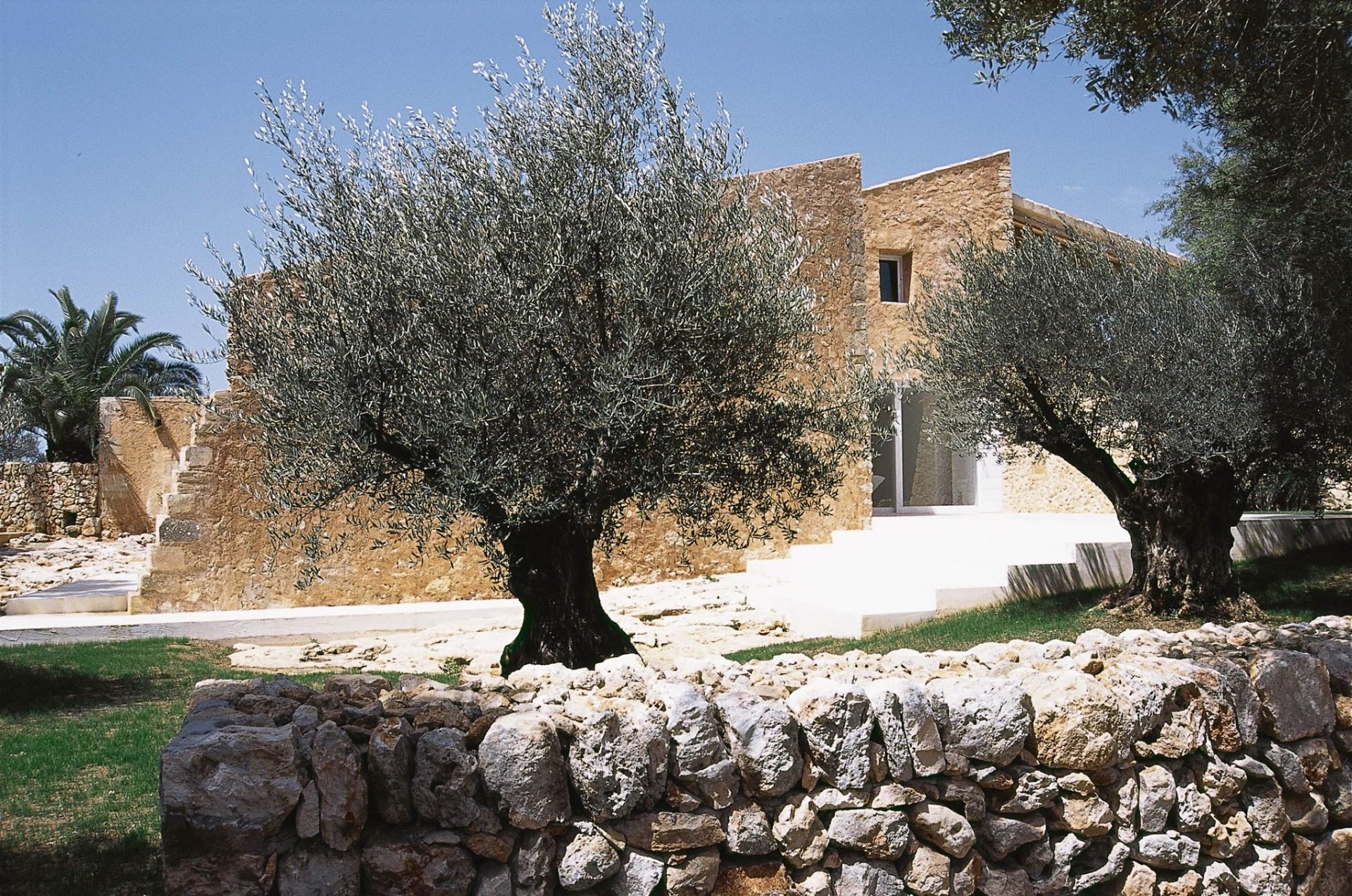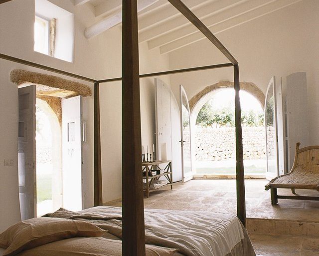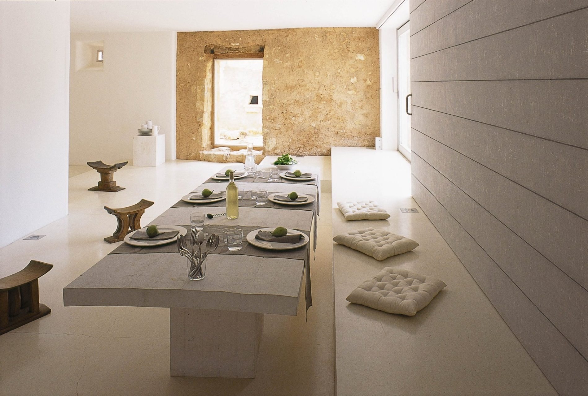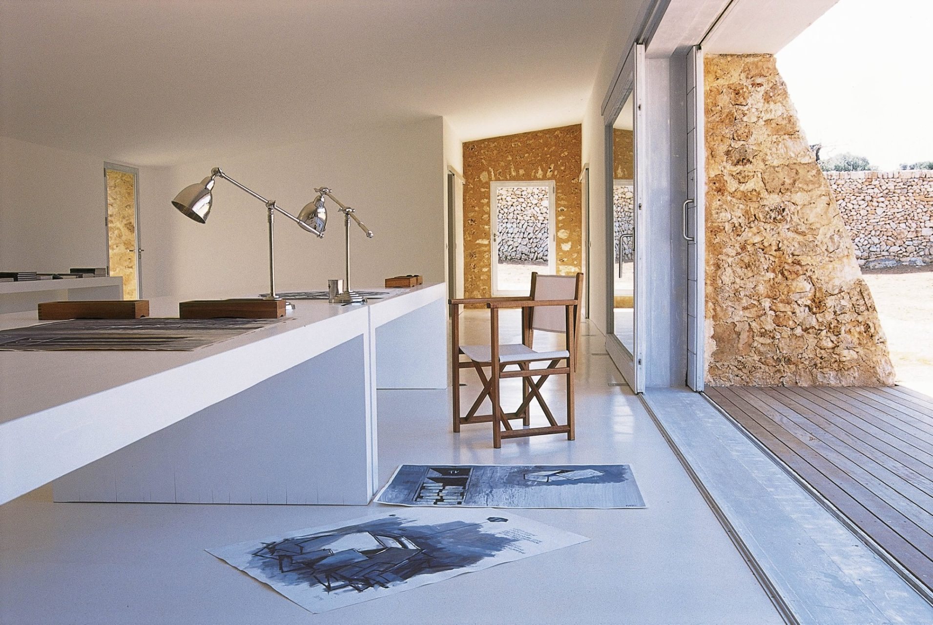 Rustico e moderno si sposano in questa casa di Maiorca, situata tra olivi e palme, muretti a secco e macchia mediterranea. Il cascinale, all’esterno, ha mantenuto la tipologia della casa spagnola, con le finestre piccole e le tinte ambrate; all’interno il bianco di mura ed arredamento lascia spazio a pareti in pietra a vista, inserti e stipiti in tufo o roccia, vetrate, antichi lavabi e portoni. In tutto domina l’essenziale: dalla piscina, alla camera da letto, alla rubinetteria. Essenziale l’arredamento dei tavoli, le stuoie, le poltroncine. Elegante nel suo gioco di luci l’ampia cucina Arclinea, dotata di tutti i confort ed estremamente moderna, con grandi ripiani di appoggio.