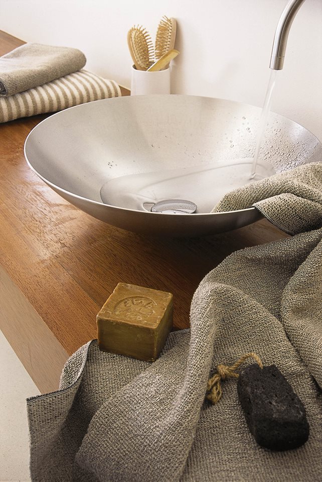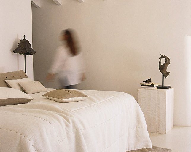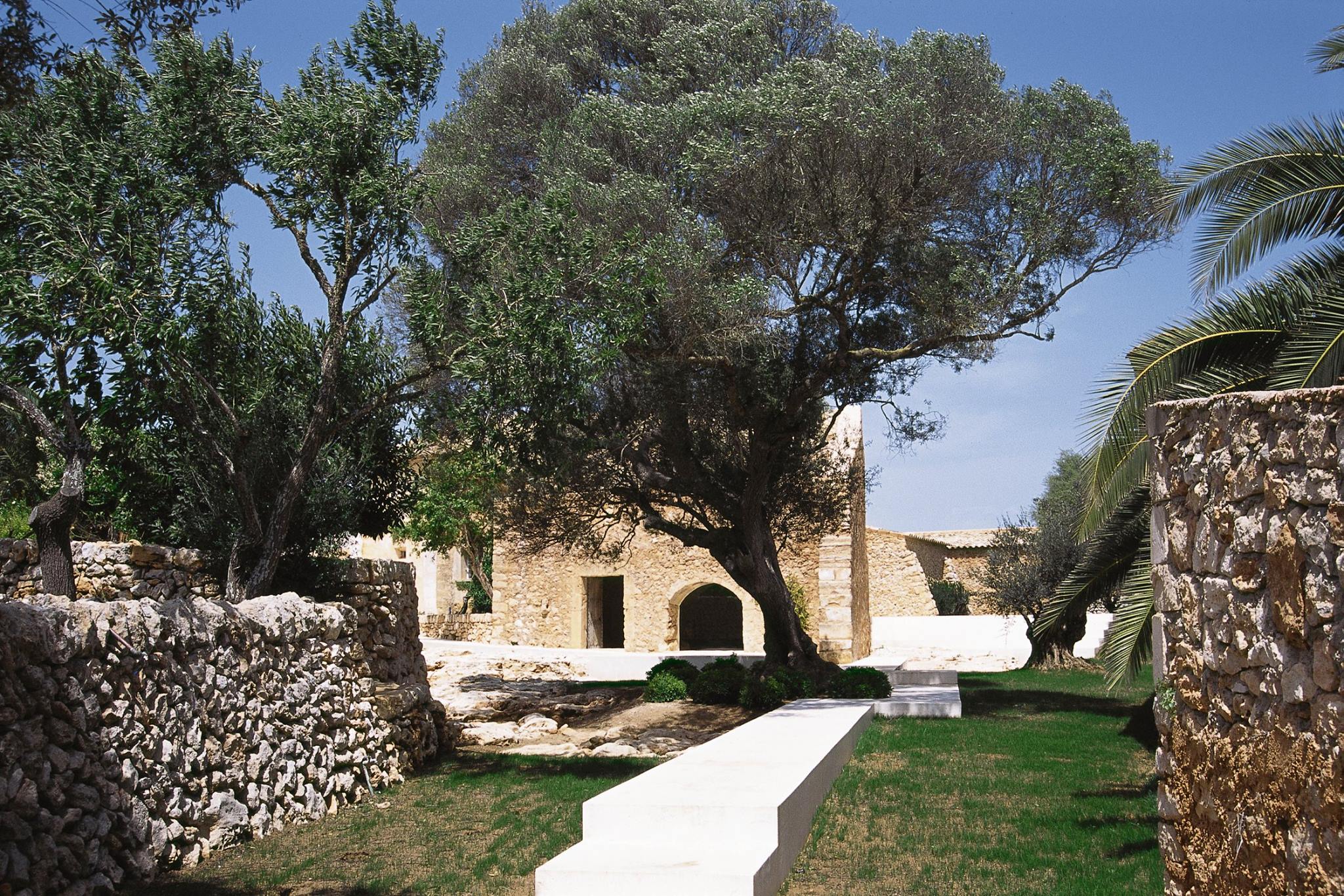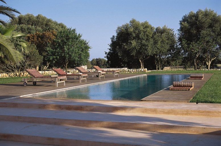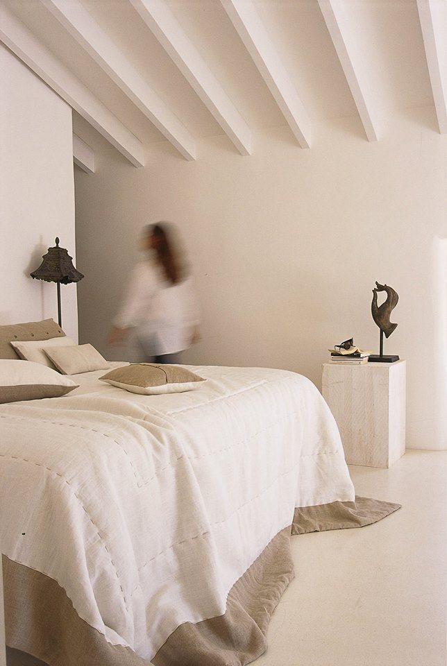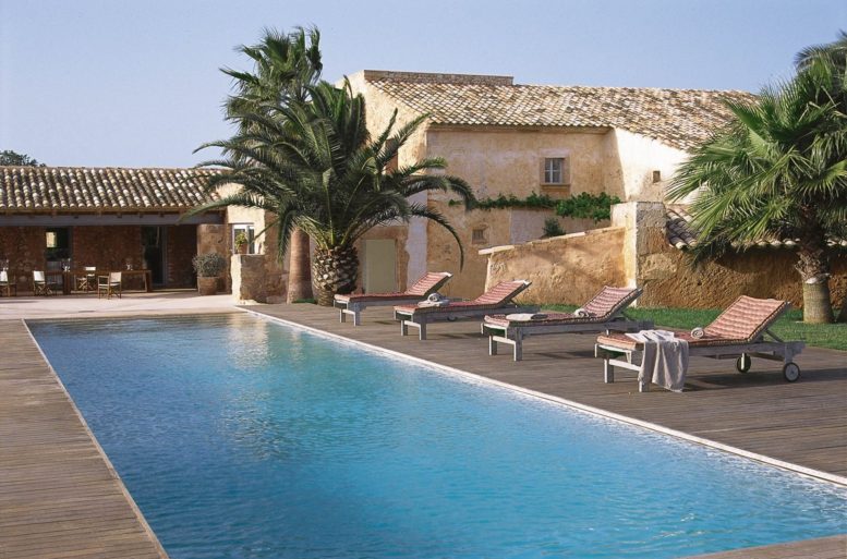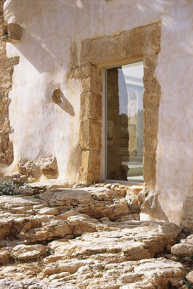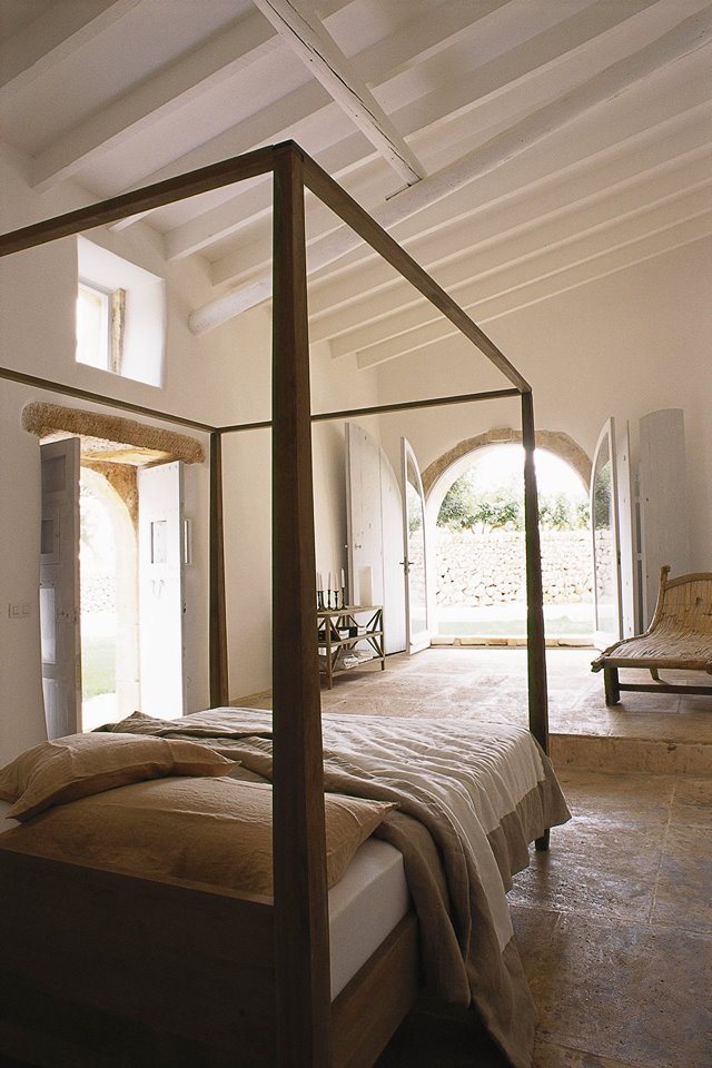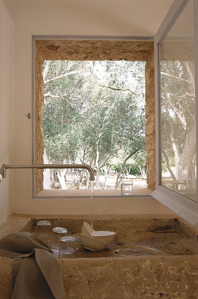Rustico e moderno si sposano in questa casa di Maiorca, situata tra olivi e palme, muretti a secco e macchia mediterranea. Il cascinale, all’esterno, ha mantenuto la tipologia della casa spagnola, con le finestre piccole e le tinte ambrate; all’interno il bianco di mura ed arredamento lascia spazio a pareti in pietra a vista, inserti e stipiti in tufo o roccia, vetrate, antichi lavabi e portoni. In tutto domina l’essenziale: dalla piscina, alla camera da letto, alla rubinetteria. Essenziale l’arredamento dei tavoli, le stuoie, le poltroncine. Elegante nel suo gioco di luci l’ampia cucina Arclinea, dotata di tutti i confort ed estremamente moderna, con grandi ripiani di appoggio.