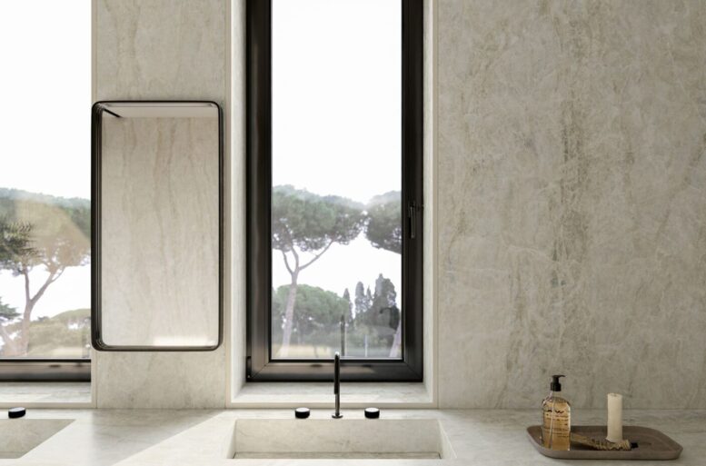 Ogni proposta della gamma si ispira a marmi, quarziti, graniti e pietre metamorfiche – come la pietra Port Laurent, il Gris Pulpis, i marmi Calacatta Lincoln, Calacatta Gold, Carrara e lo statuario – reinterpretati attraverso tecnologie all’avanguardia.
