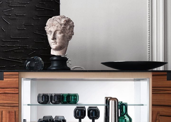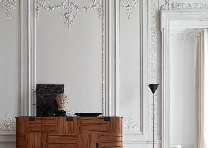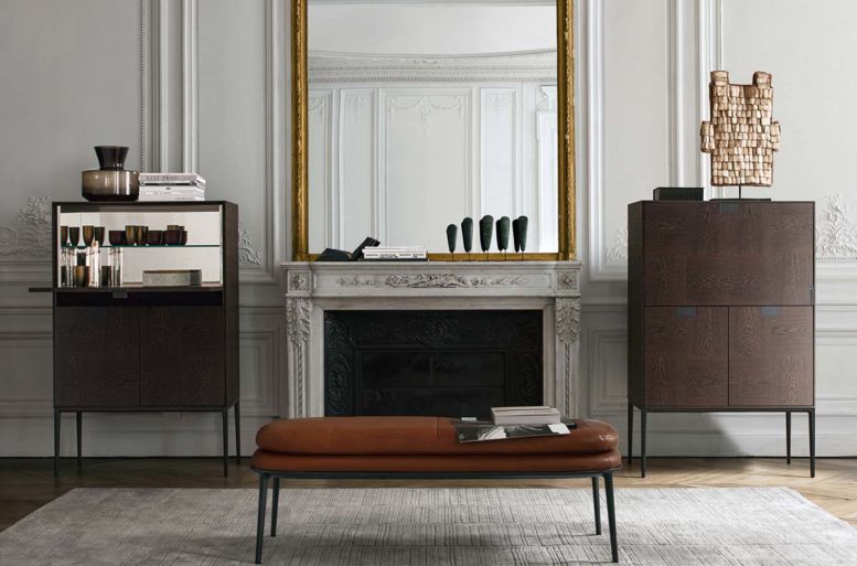 The neoclassical and modern 2020 catalog includes innovative materials that were not used in previous collections and forms an interior design concept inspired by the atmospheres of French modernism, where different styles merge. An example can be found in the “burnt” wood treated with a derivative technique from the Japanese Shou Sugi Ban.