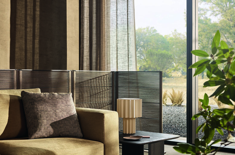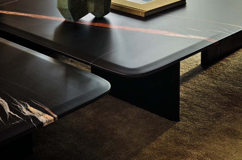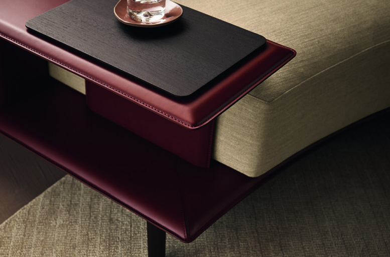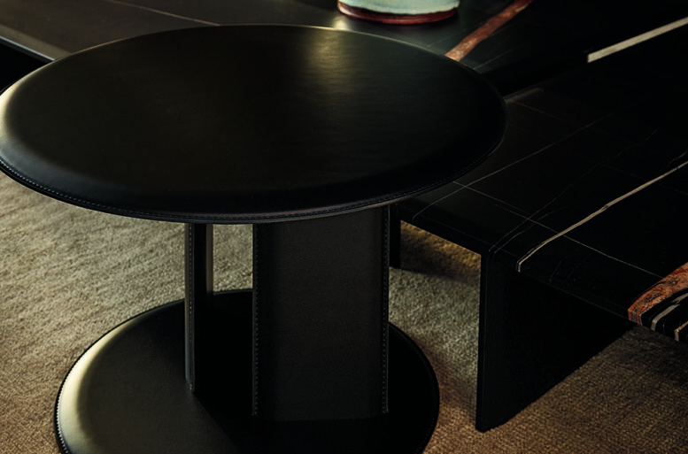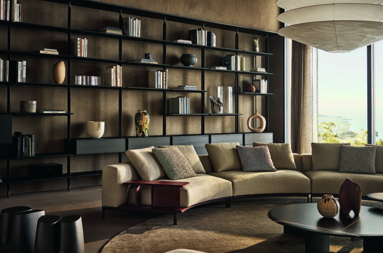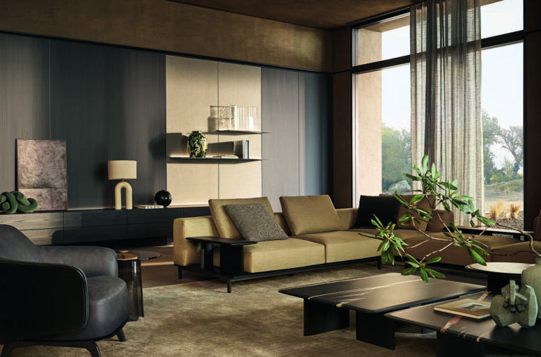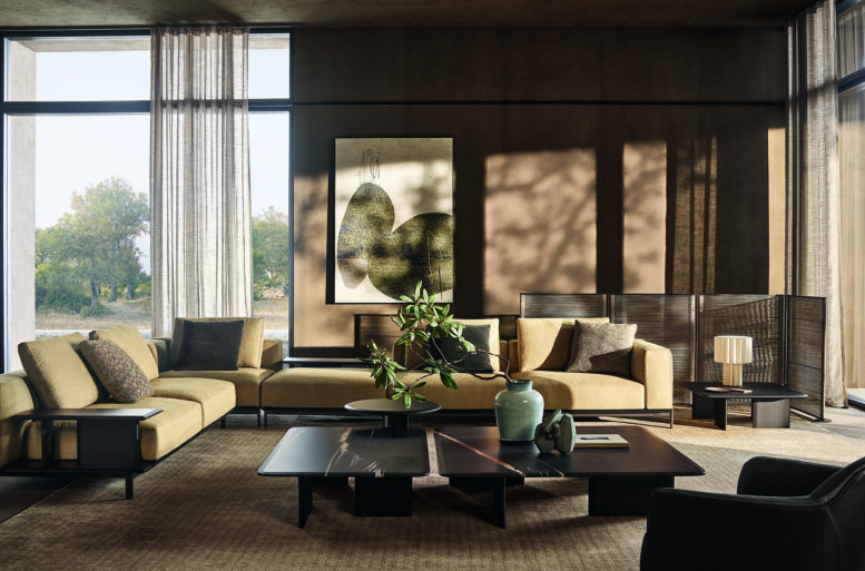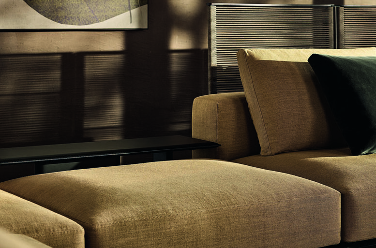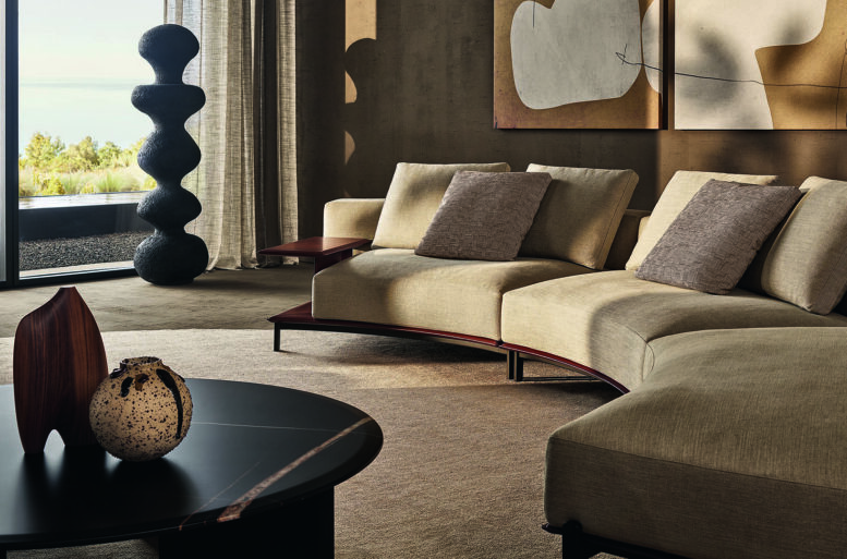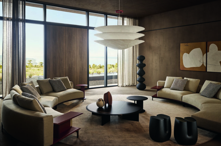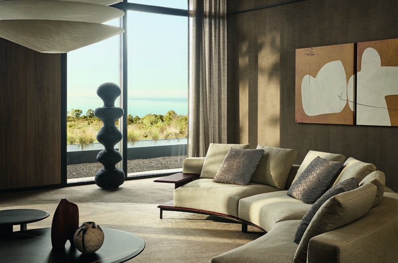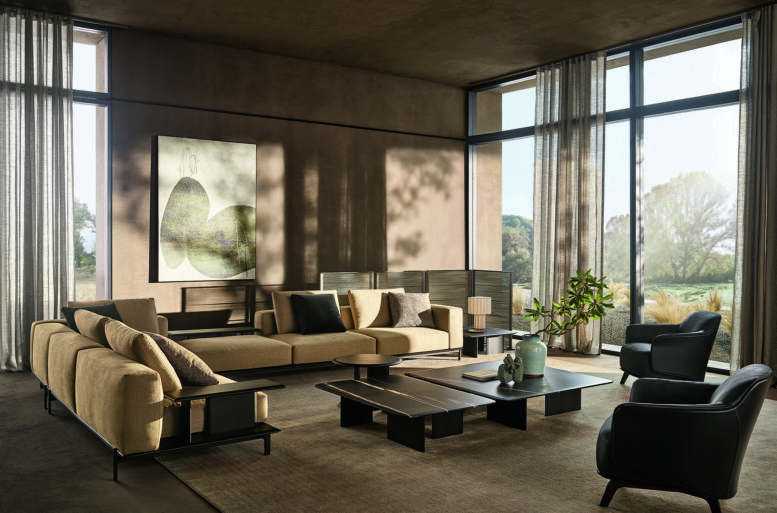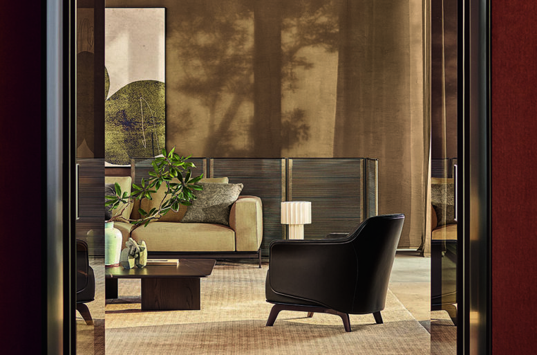 The more intimate and cosy second living room combines the architectural lines of the sofa with the enveloping curves of the armchairs and sophisticated accessories such as the screen.