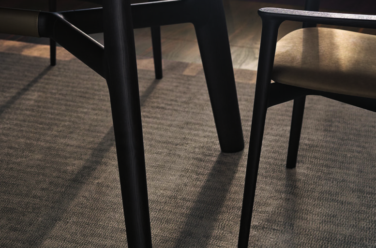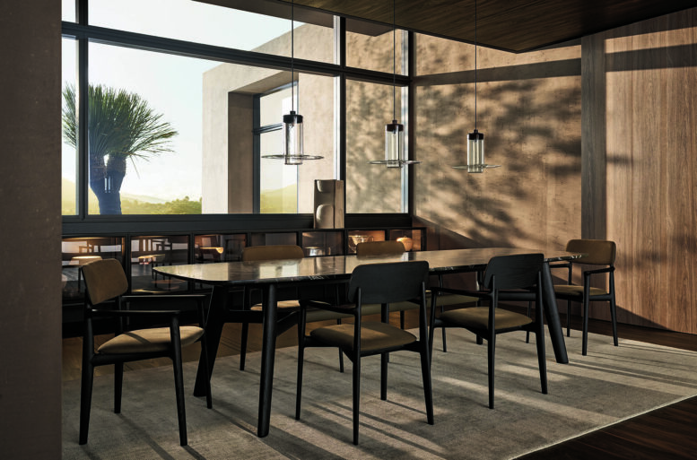 The connection between the dining room and the exterior is fluid. This sense of fluidity is created not only through the skillful chromatic combination of furnishings and natural elements, but also the symbolic connection in terms of materiality and texture.