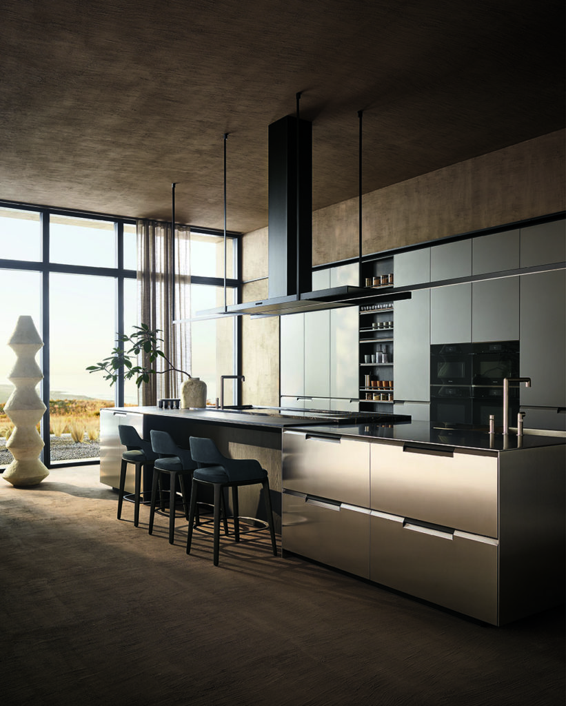 Aesthetics and functionality also find perfect harmony in the kitchen, where the central operating island welcomes the elegant wooden top. The neutral shades are in continuity with the other rooms of the house.