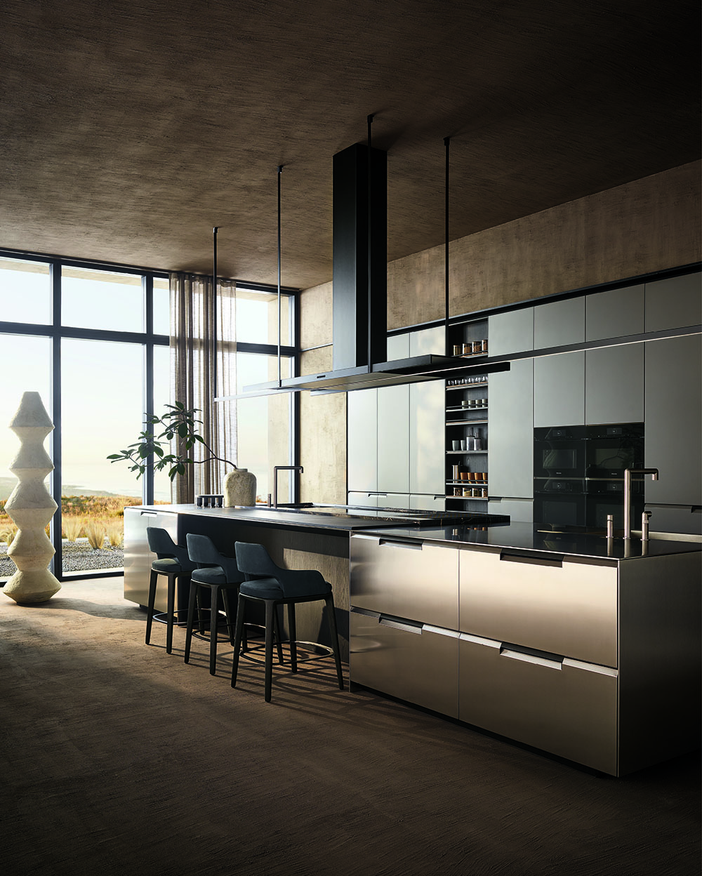 The connection between the dining room and the exterior is fluid. This sense of fluidity is created not only through the skillful chromatic combination of furnishings and natural elements, but also the symbolic connection in terms of materiality and texture.