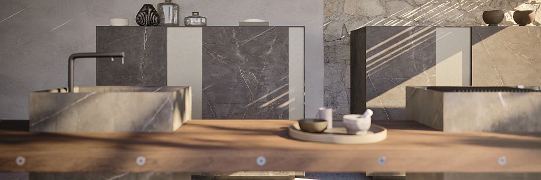 In Project 1, the special hob and washbasin blocks of the Block system with three Gold Brown stoneware staves, whose surfaces recall natural stone, stand out. The Block system defines a washbasin block equipped with a basin for washing and a pull-down mixer tap. The cooking block is completed by the Mate countertop, which is suitable for outdoor solutions because it is resistant to the weather, humidity and saltiness. This technical equipment is also customisable: the freestanding Mate hobs, electric or gas, in AISI 316 steel, in fact, are easily removable, interchangeable and can be positioned with maximum freedom. Furthermore, it is possible to complete the hob with the most suitable equipment to meet one's own aspirations or technical requirements, for example by inserting induction hobs, teppanyaki plates or a barbecue grill.