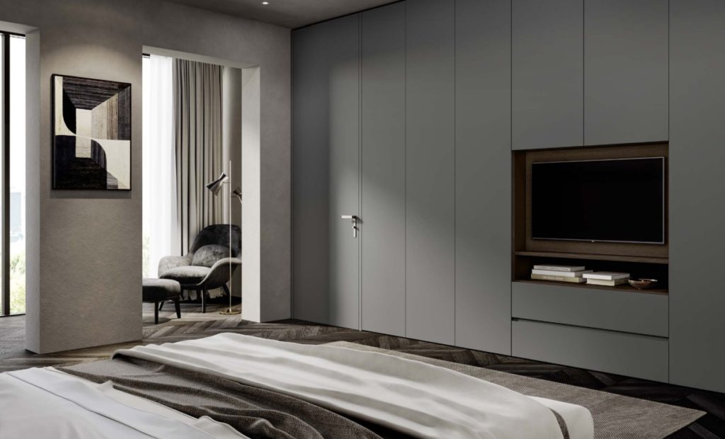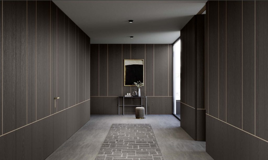 Wall paneling covers the walls, creating a seamless link between aesthetics and functionality. Panels can be linear and minimal or enriched with modules that integrate invisible doors, built-in wardrobes, or even walk-in closets, bringing harmony and visual clarity to the space. Crafted from fine wood veneers, matte or glossy lacquers, frosted glass, and metal inserts in painted or bronze finishes, they become a refined “skin” for the home.