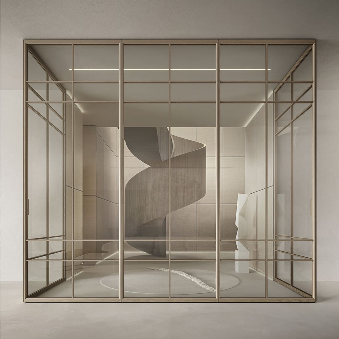 Air System is a system of fixed panels that, combined with the bidirectional doors of the collection, allows for flexible space definition. Compositions can be linear, angled, or T-shaped, with installations either freestanding or recessed.