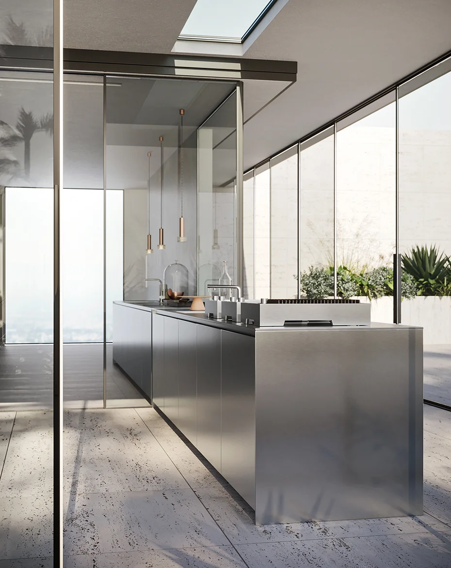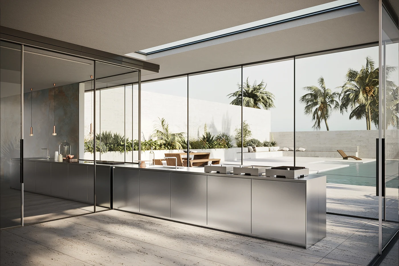 The result is a fresh and ultra-modern setup, unique in its minimalist functionality, ideal for spaces where indoor and outdoor areas merge into a single creative and livable environment.