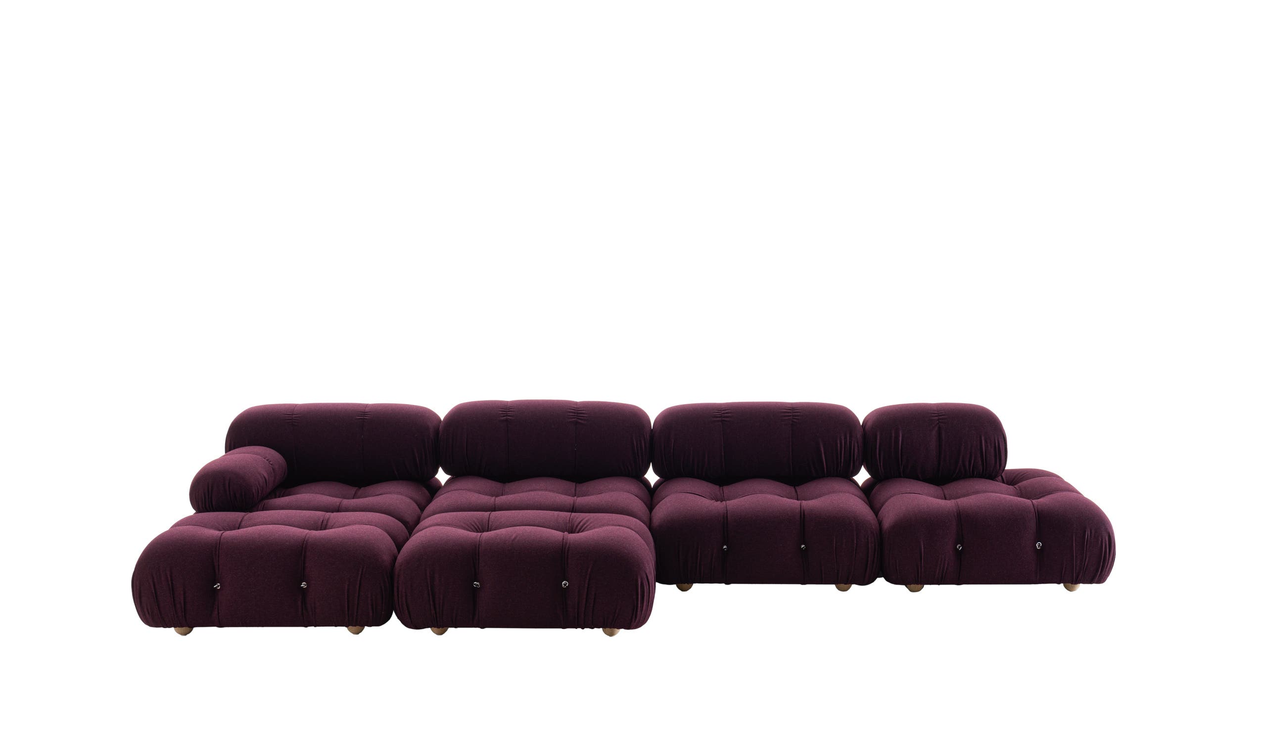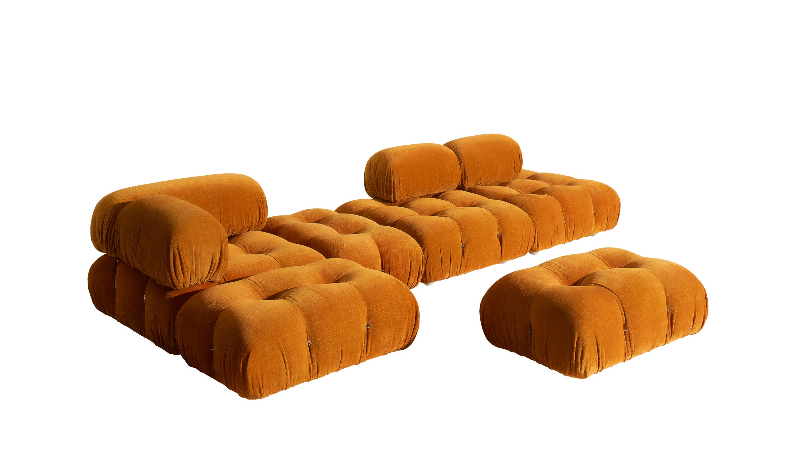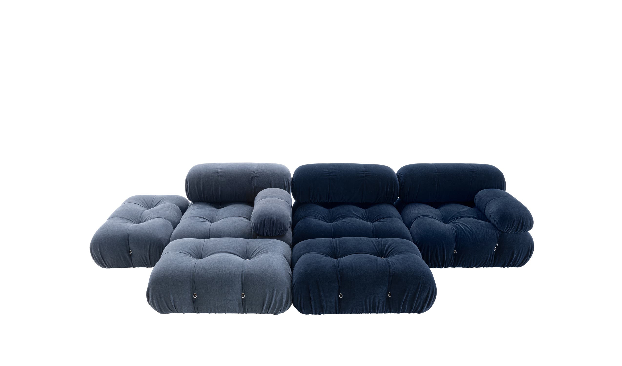 In its new version, Camaleonda retains the elements that made it a timeless icon. The 90×90 cm seating modules, backrest, and armrest, together with the characteristic capitoné, remain faithful to the original design developed by Mario Bellini in 1970. This special capitoné continues to be crafted using an innovative system of cables, hooks, and rings, preserving both its aesthetic structure and customization options.