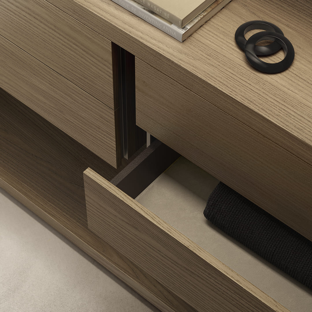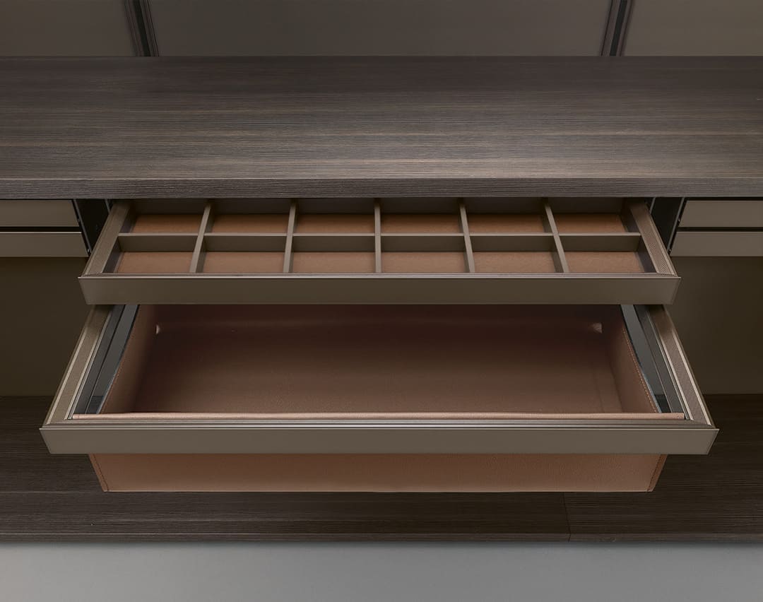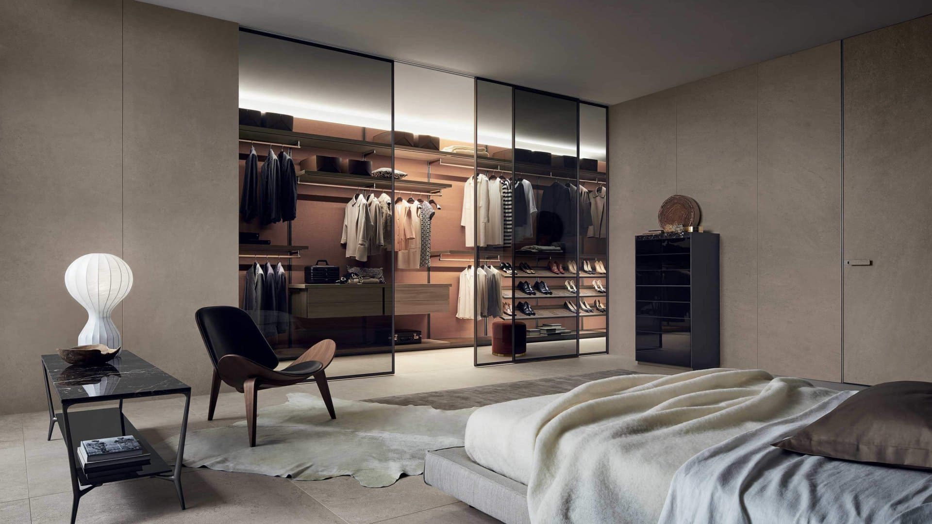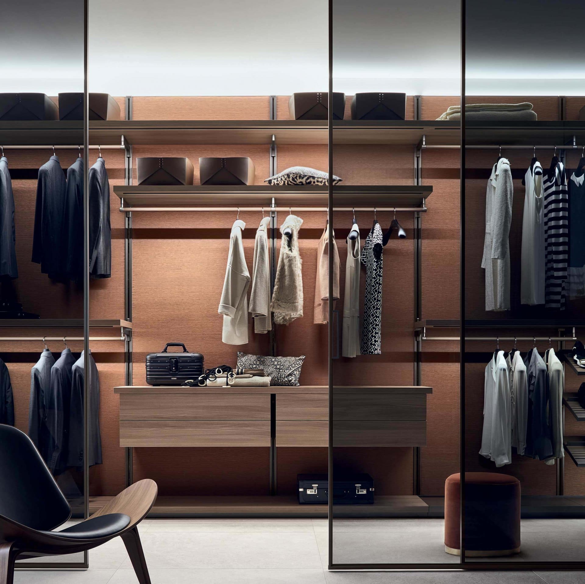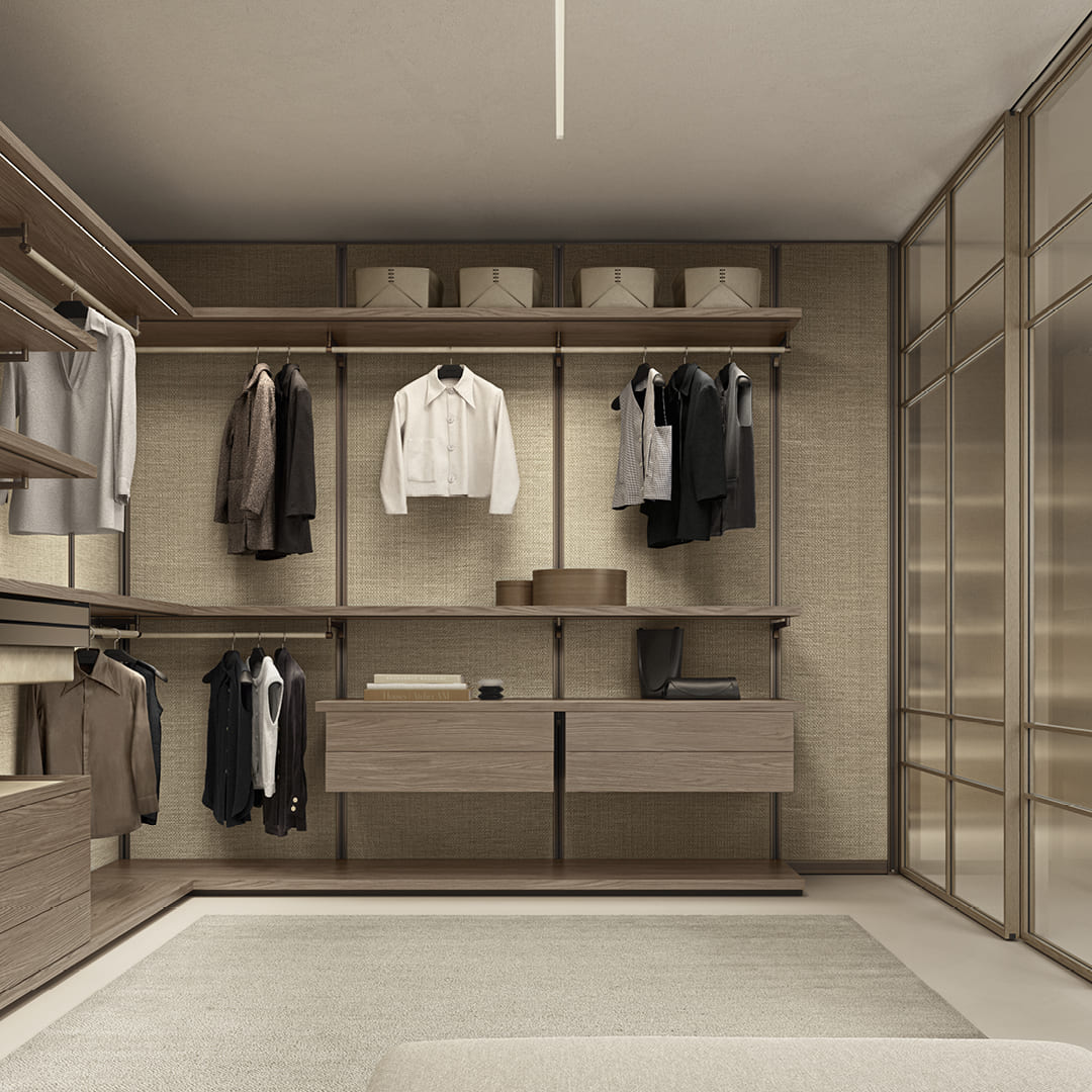 Dress Bold is a system designed to create fully customizable walk-in closets, with tailor-made compositions in linear, corner, or C-shaped layouts. Two main aesthetic options are available: with exposed uprights or with wall panels, offered in glossy or matt lacquered glass, fabric, leatherette, raffia, wood, mirror, and Litech, with optional top LED lighting.