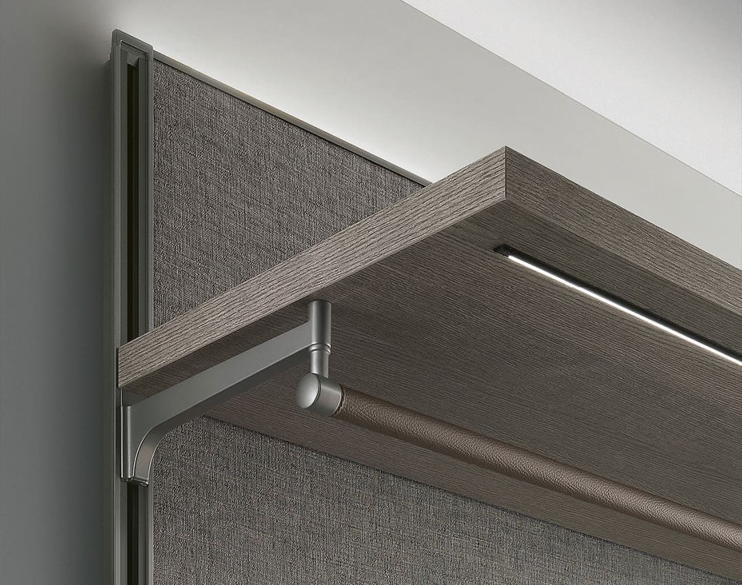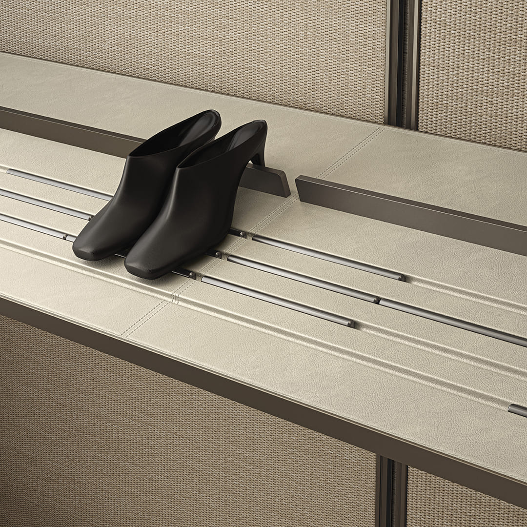 The system provides an ideal level of lighting and allows full customization of both intensity and quality of the light, thanks to LED sources that can be positioned under the floor base, beneath shelves, under shoe racks, or at the top of the back panel, which is available in the same panel finishes. The angled shoe shelf features a quick and invisible attachment, with no screws or visible joints, ensuring a perfectly clean aesthetic.