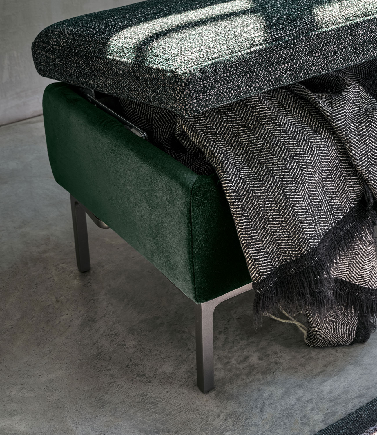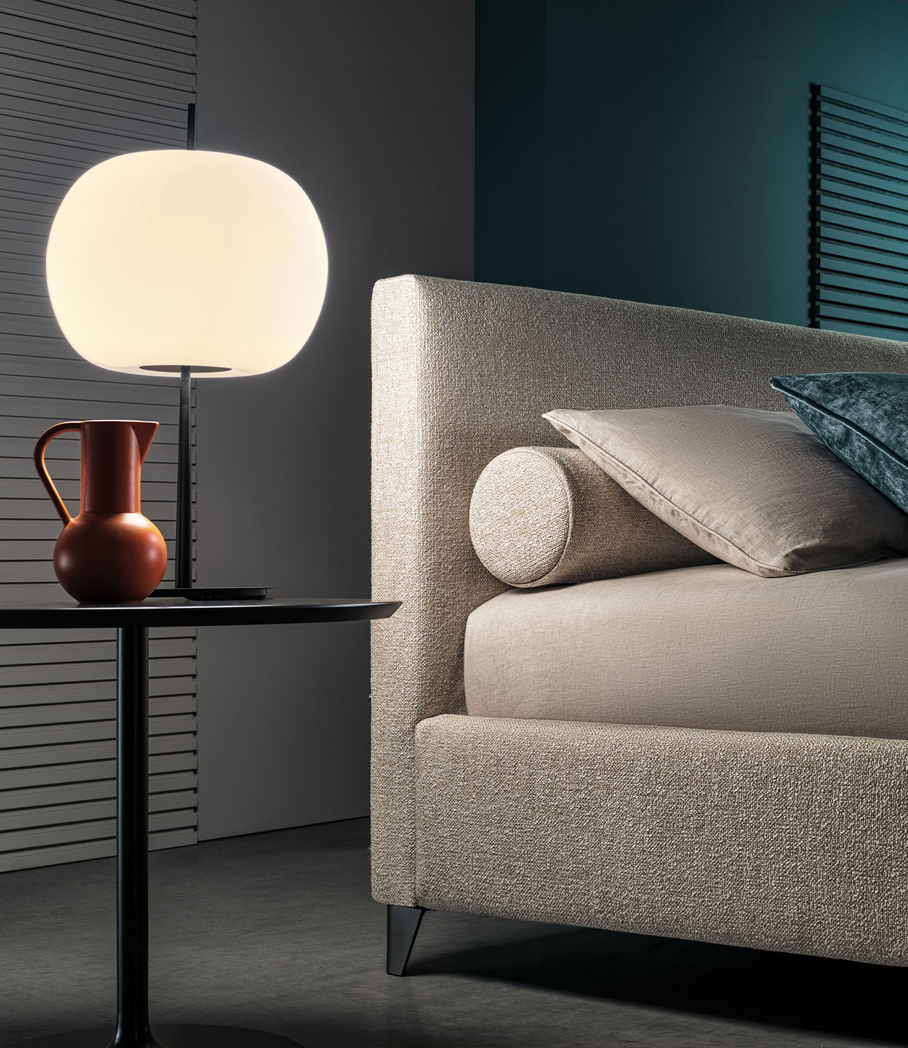Max is a bed that combines visual solidity with enveloping comfort, making a strong presence in the bedroom while reinterpreting the upholstered bed archetype in a contemporary way. The generous proportions of the bed frame, which almost merge with the floor, convey a sense of stability and protection, like an island to rest upon, leaving the outside world behind.
