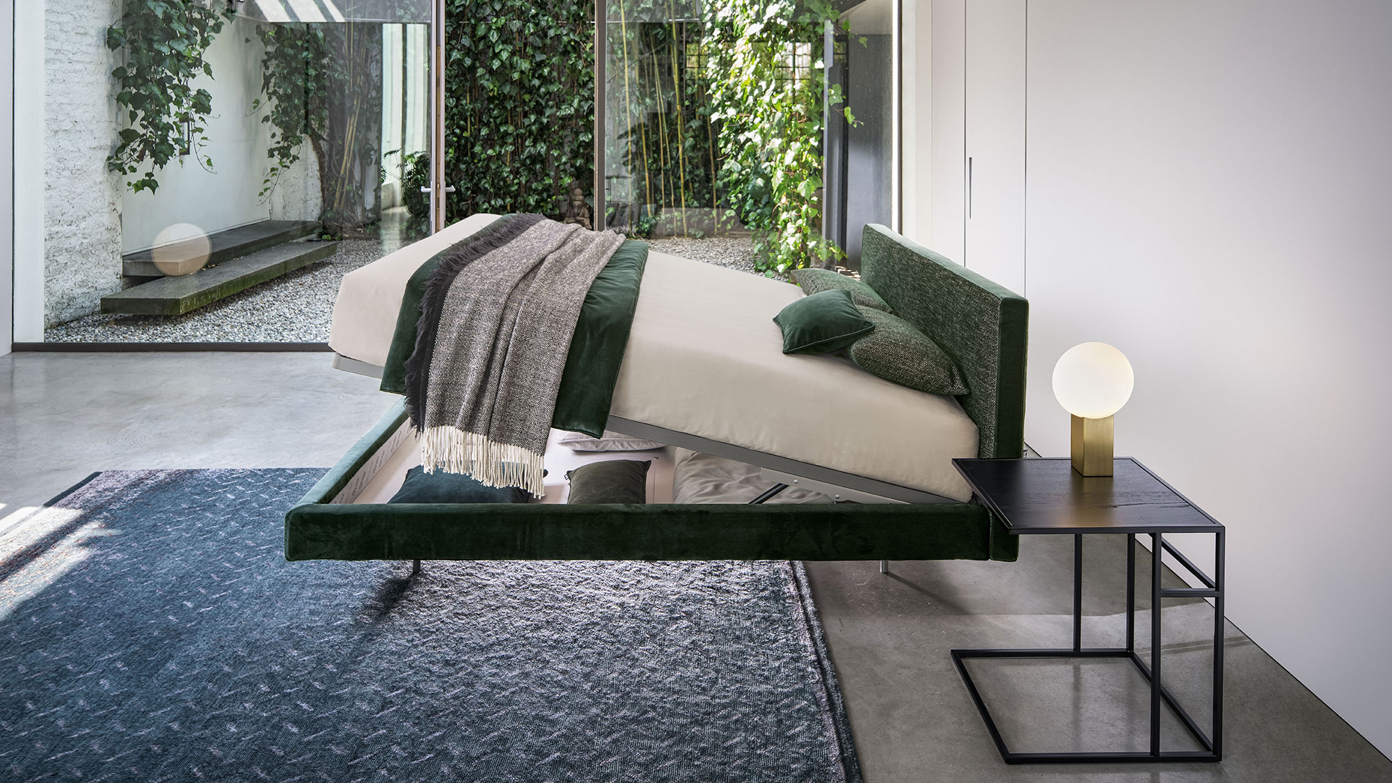 The Max bed is available in three configurations: Max Alto, with a tall, substantial frame; Max Basso, lighter and more minimal in perception; and Max A-Box, equipped with storage for added functionality without compromising elegance.