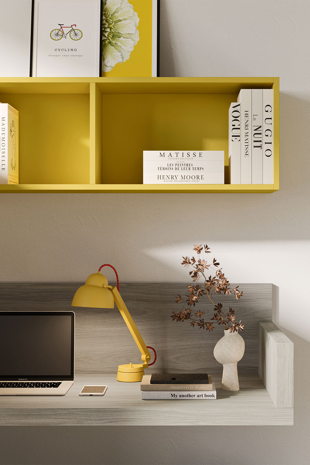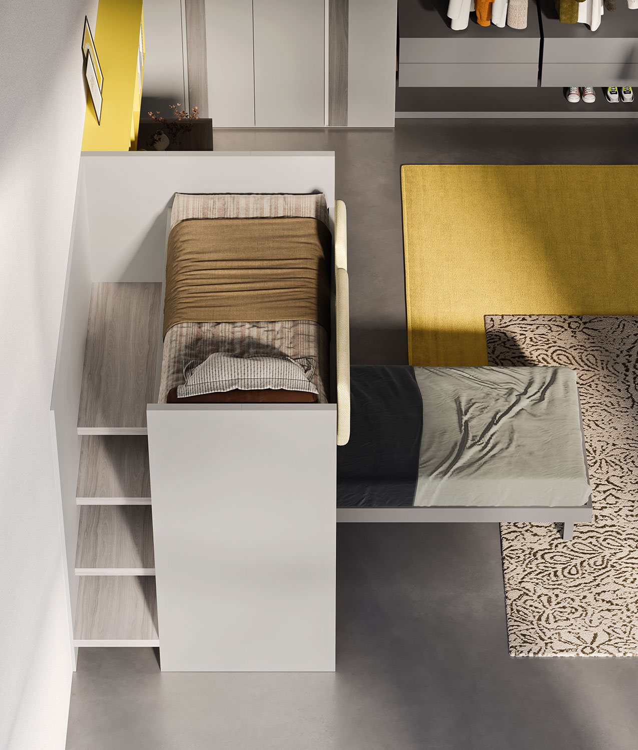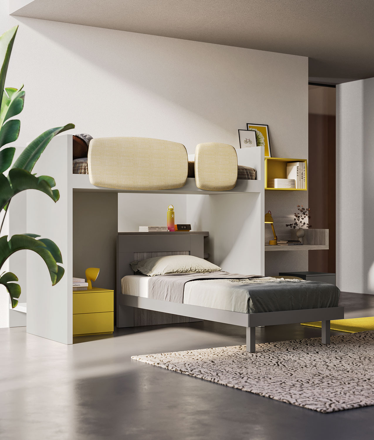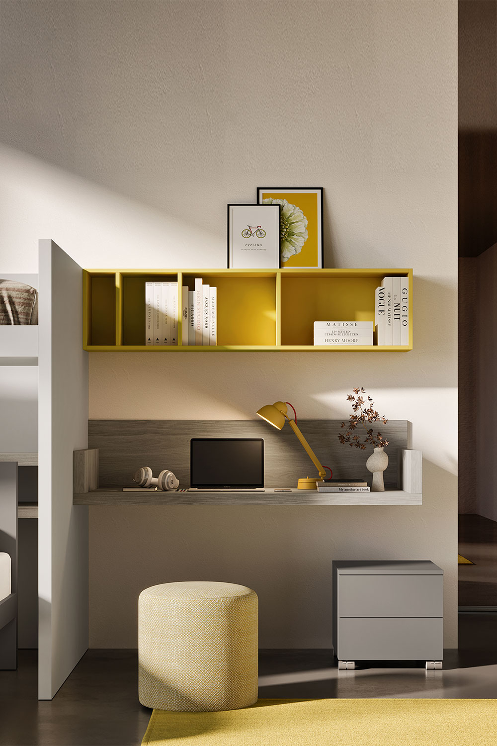 Start S23 is a loft bedroom designed for two children, whether twins or of different ages, featuring two single beds arranged in an L-shape, a study corner, and a spacious wardrobe. Designed to be highly customizable in dimensions, colors, finishes, and layout, this solution optimizes space, providing everything needed for sleeping, studying, and storage.