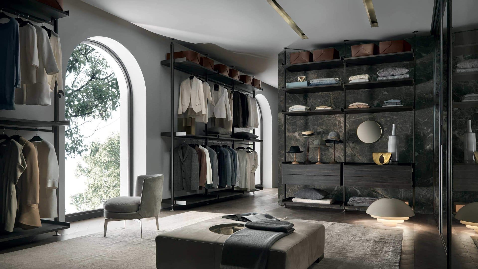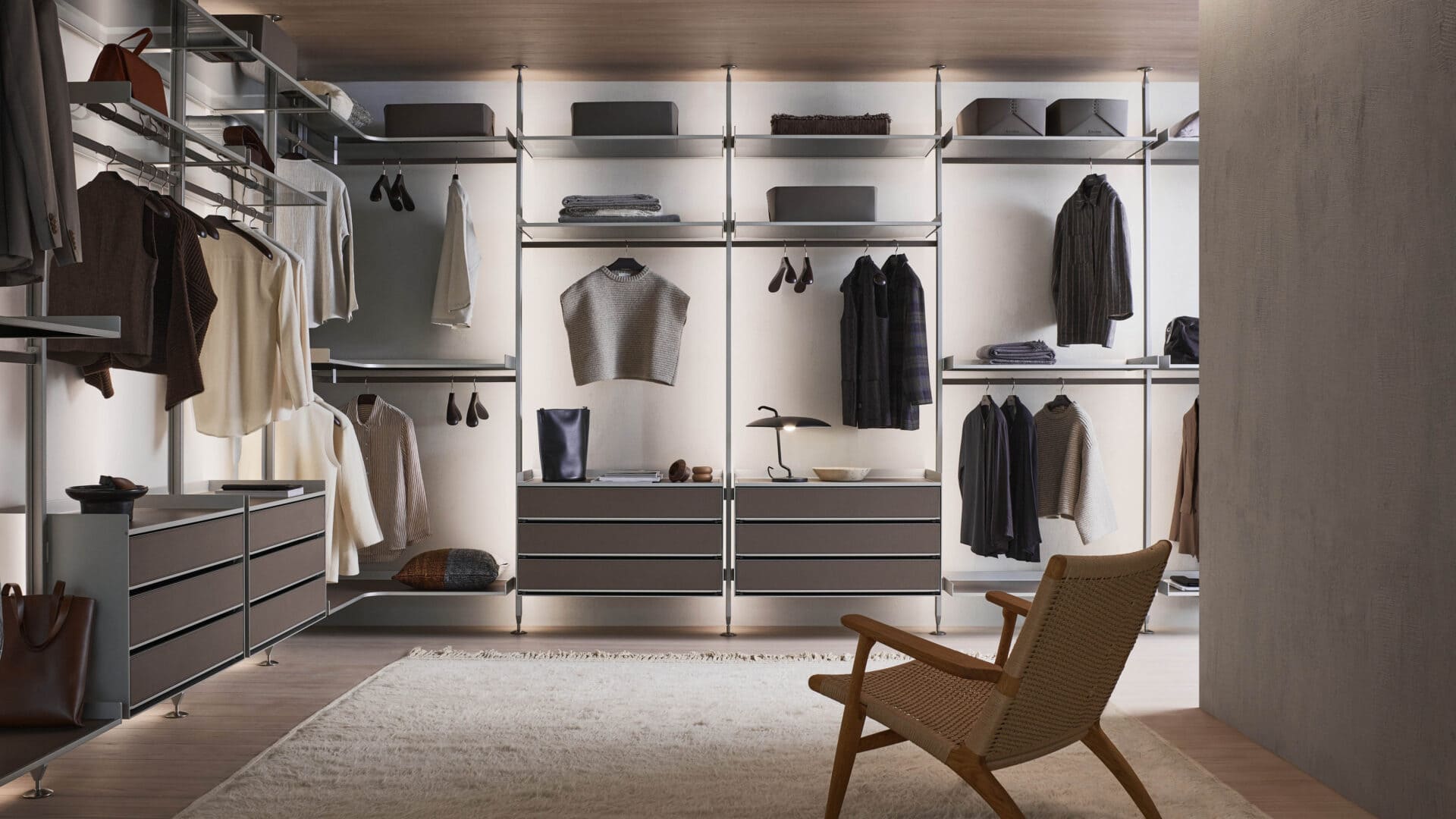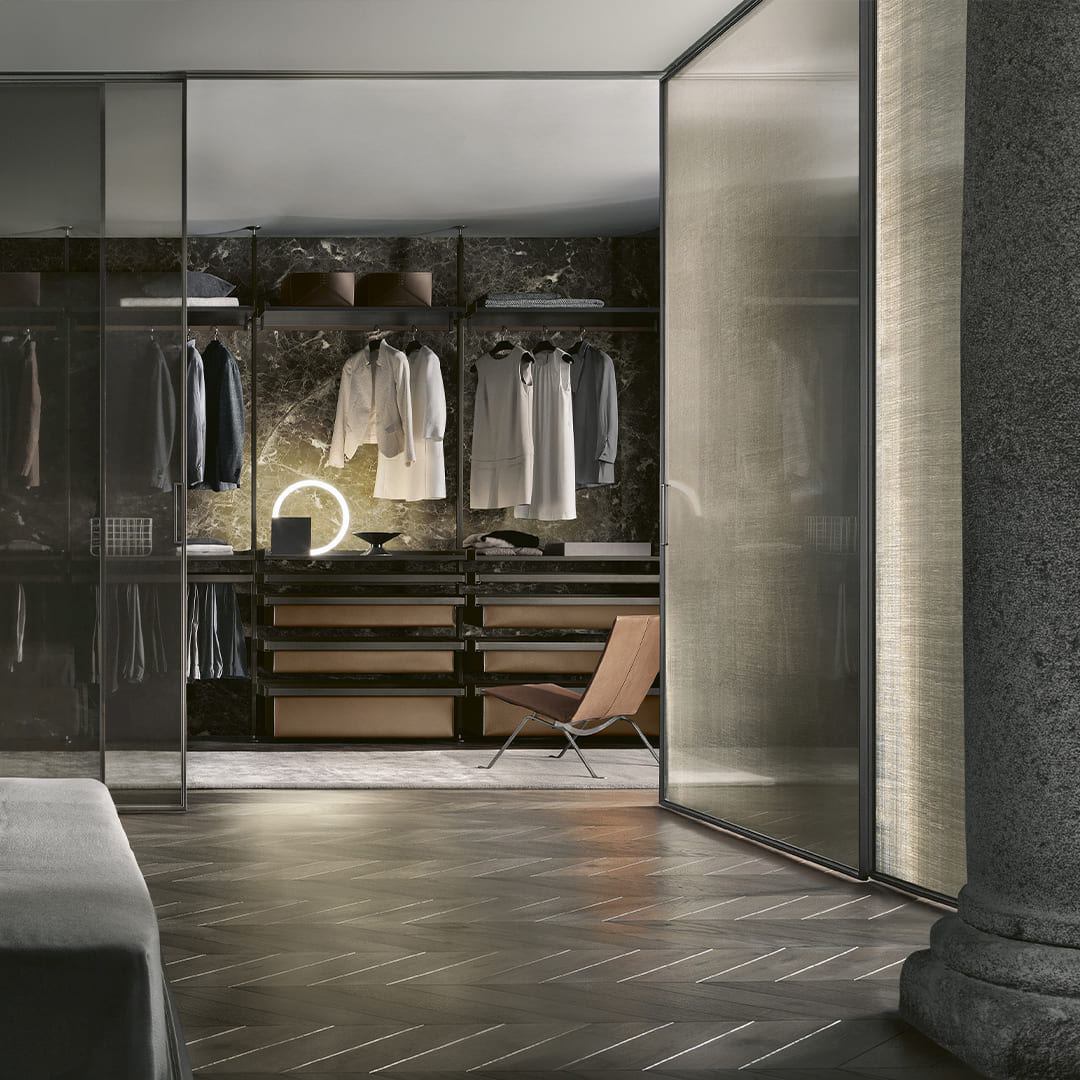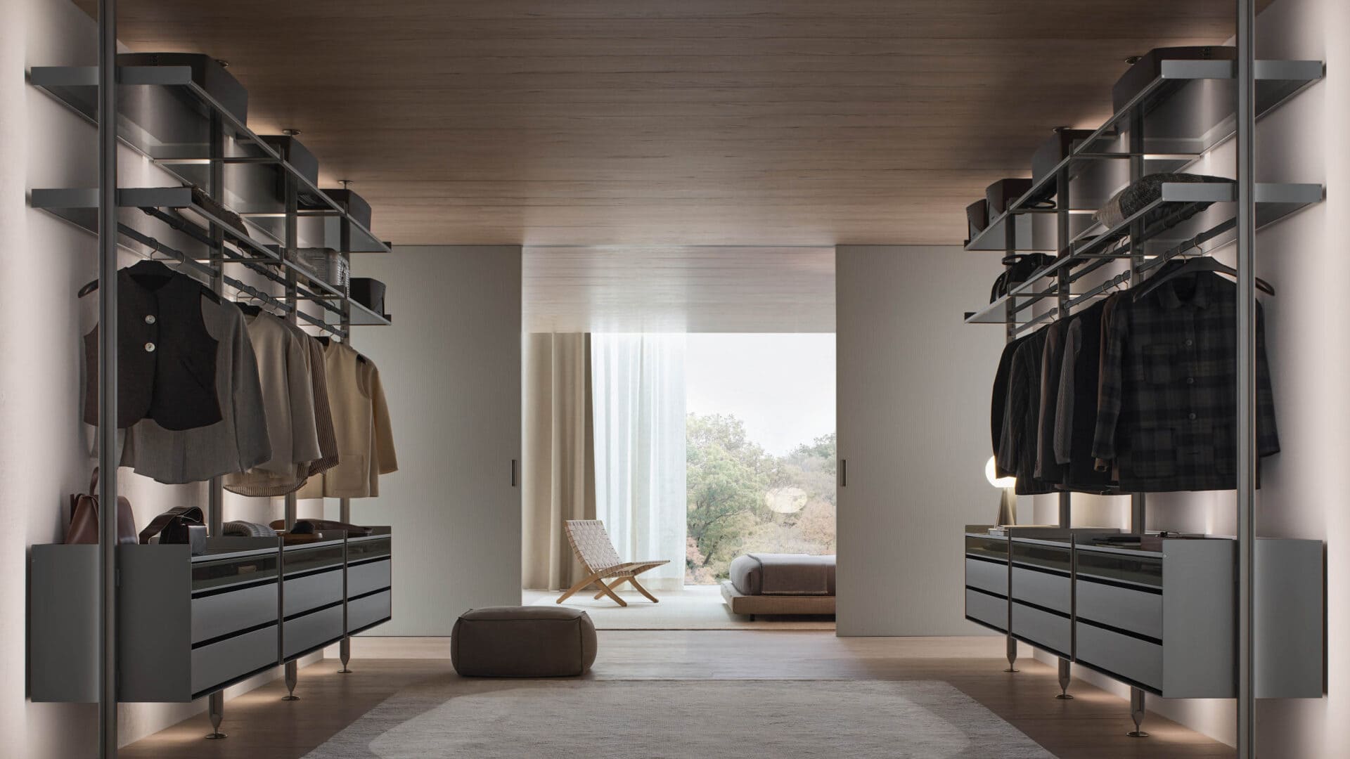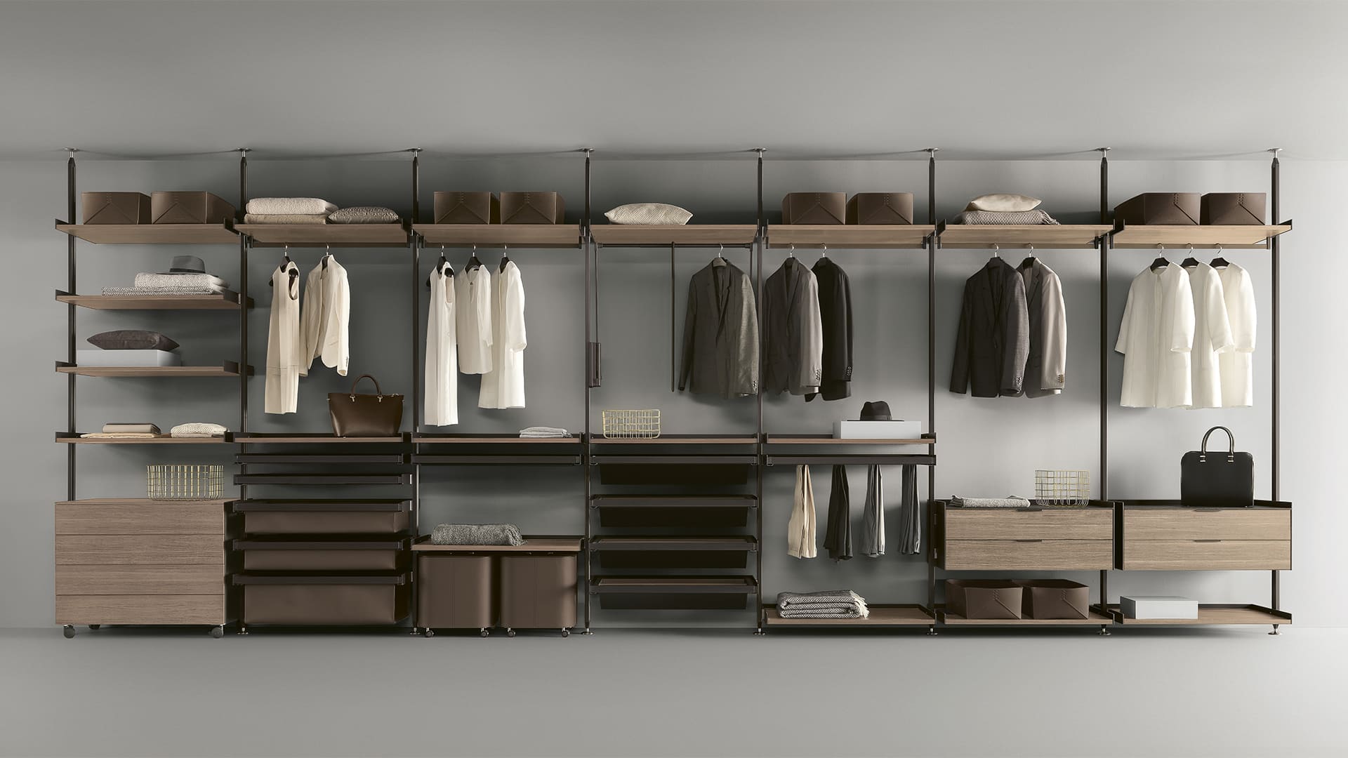 Zenith is a walk-in closet that combines lightness and compositional versatility. The made-to-measure uprights, extending from floor to ceiling, allow complete freedom in positioning the fittings, both in number and at the desired height.