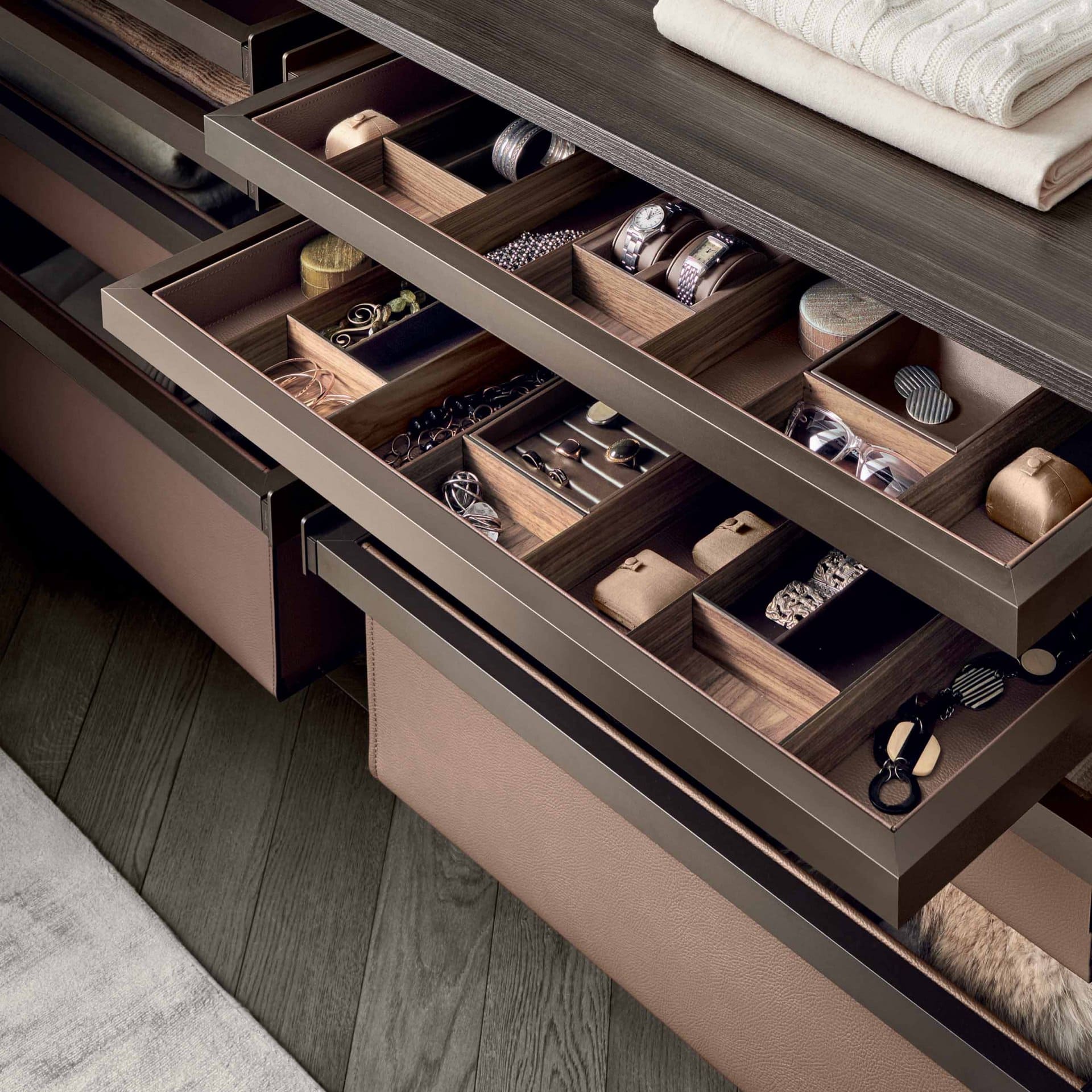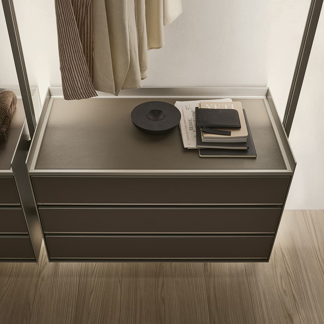 Available in three widths, three heights, and four aesthetic versions, they meet every organizational need of the walk-in closet: open drawer without front, drawer with glass front, drawer with lacquered aluminum front, and drawer with leatherette front.