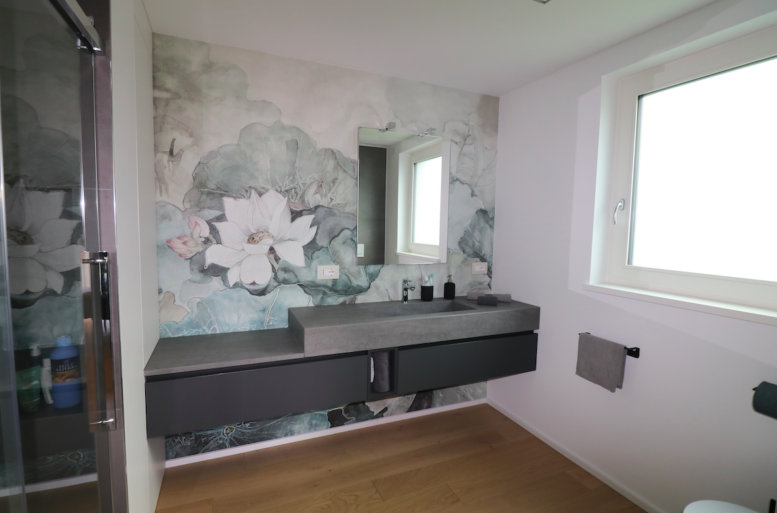 We can find the wooden floor also in the bathroom. Here the wallpaper greatly characterizes the whole room. The bathroom furniture, signed by Modulnova, has a quartz top with two thicknesses, which gives the possibility to make the sink in the same material, creating a single minimal unit.