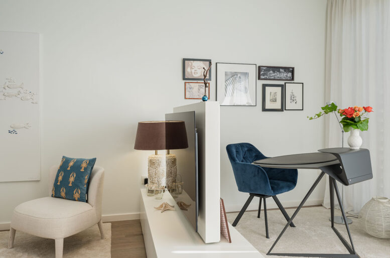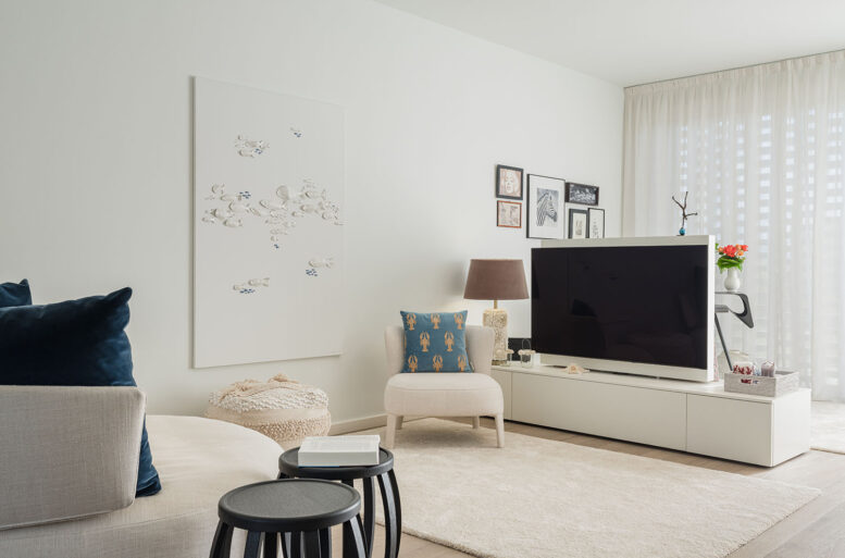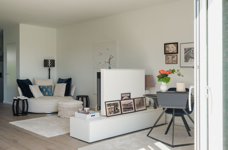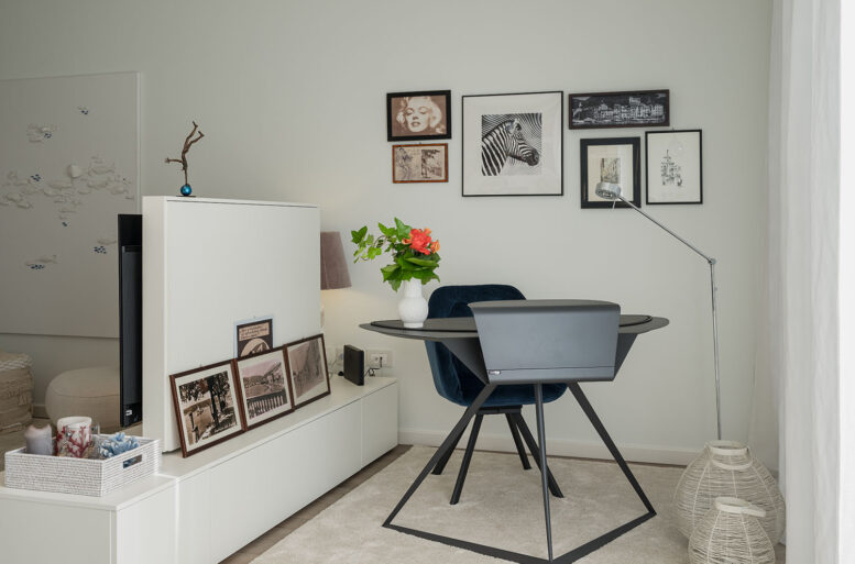 The living room is the key area of the house, where the living area and the study area interact coherently. The sofa and armchair, both by MAXALTO, declined in light nuances reminiscent of candid sands, contrast with the study area, created with a small desk/console by CATTELAN ITALIA, very particular in its geometries, divided by a piece of furniture that allows view of the TV top.