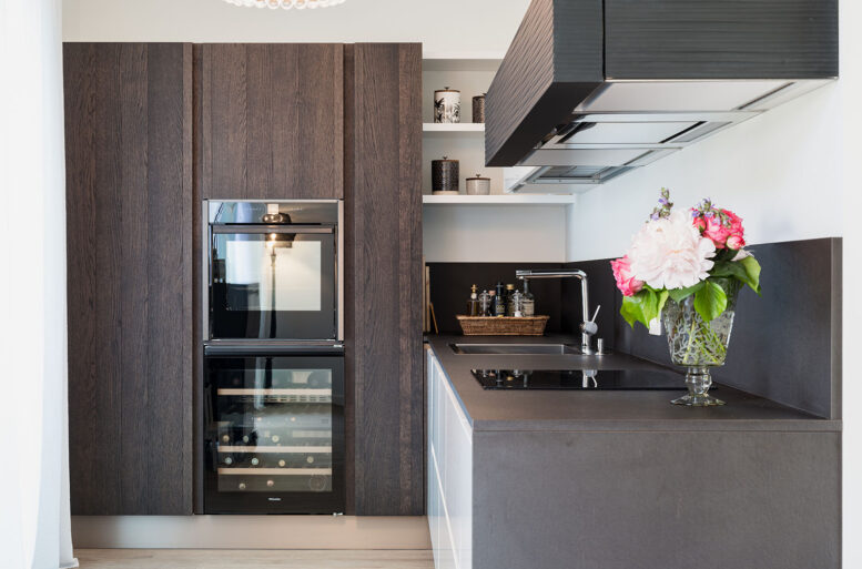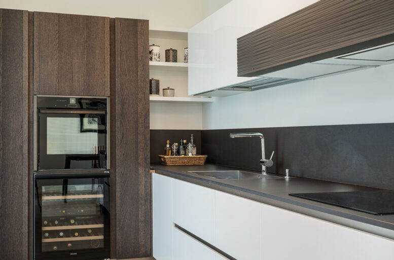 The only exception is found in the kitchen, from the MODULNOVA line, My Kitchen model, essential in its linearity, made of dark gray oak and embellished with lacquered surfaces.