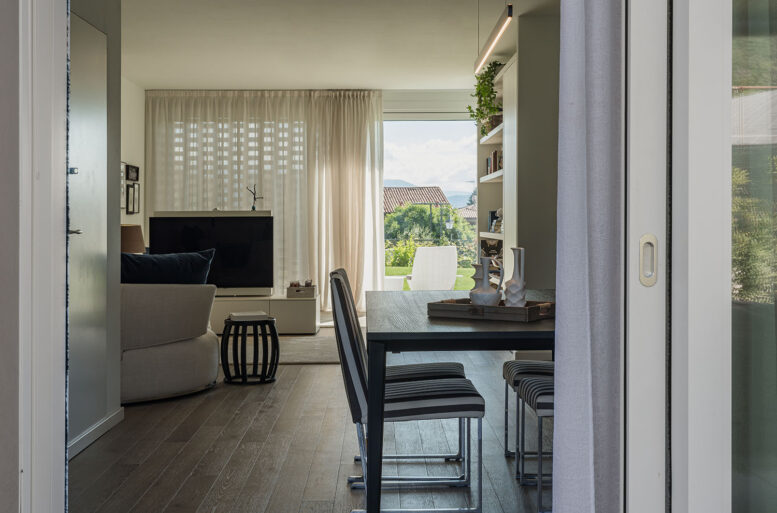 Ballarini Interni has taken care of this very particular interior, sartorially set up according to the needs of a family of three, originally from Monaco, whose dream of a holiday home on Lake Garda has found its realization in this beautiful apartment with a green flavor, in the hinterland of Salò.
