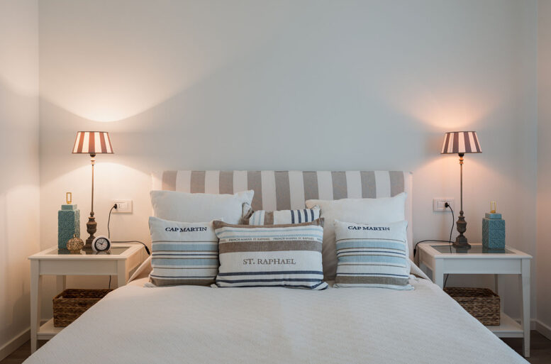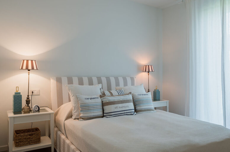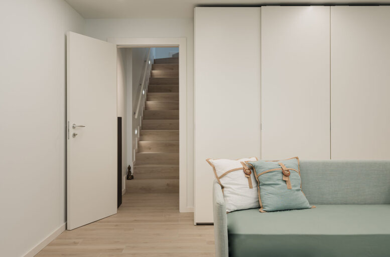 If already in the living area we find many references to the sea and its essence, it is in the sleeping area that the concept is sublimed, with the choice of bed structures made with upholstered linen in natural and soft colors, produced by GERVASONI, both in the double, both in the single bed variant, with essential and minimal shapes.