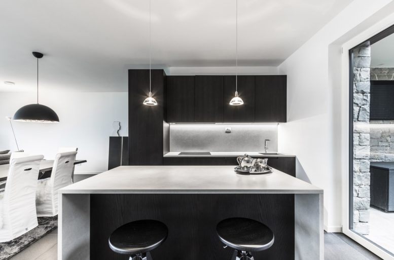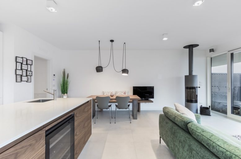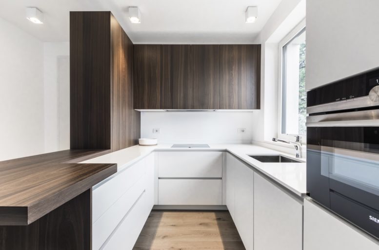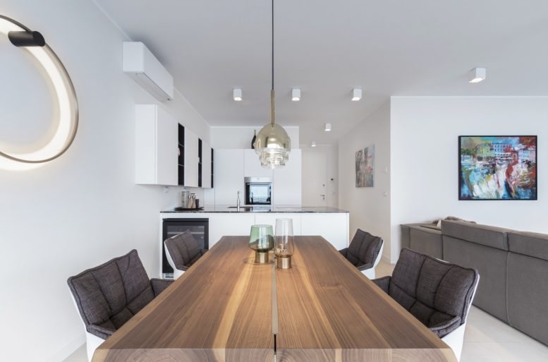 In a second design solution for the kitchen and dining area, we again see a contrast between the base color, white, and the functional surfaces in a unique material, wood, used for the cabinets in the cooking area and the dining table top.