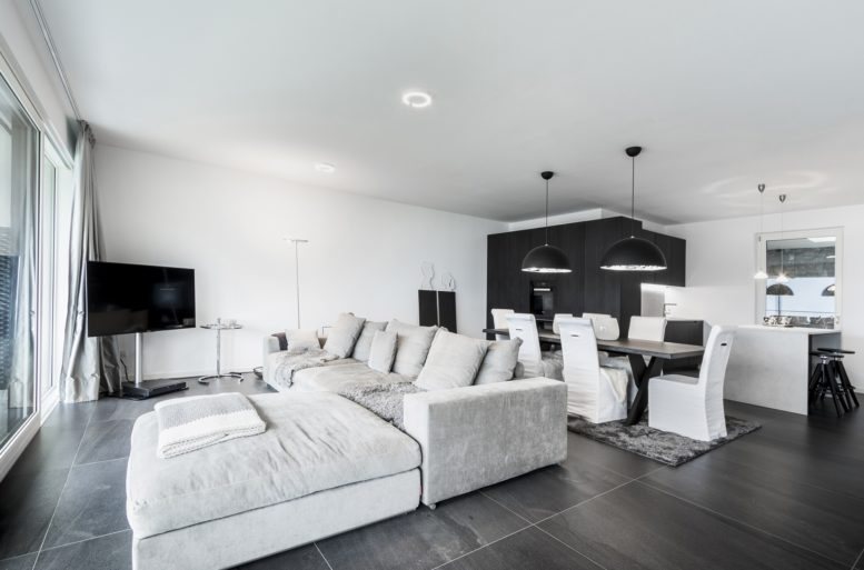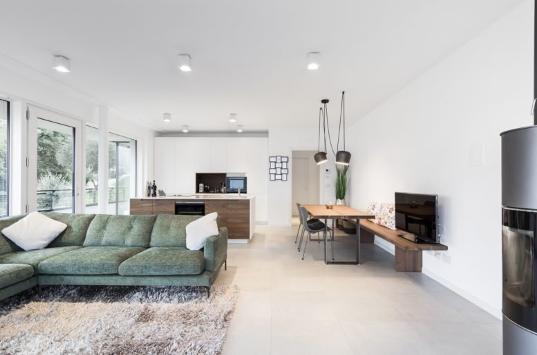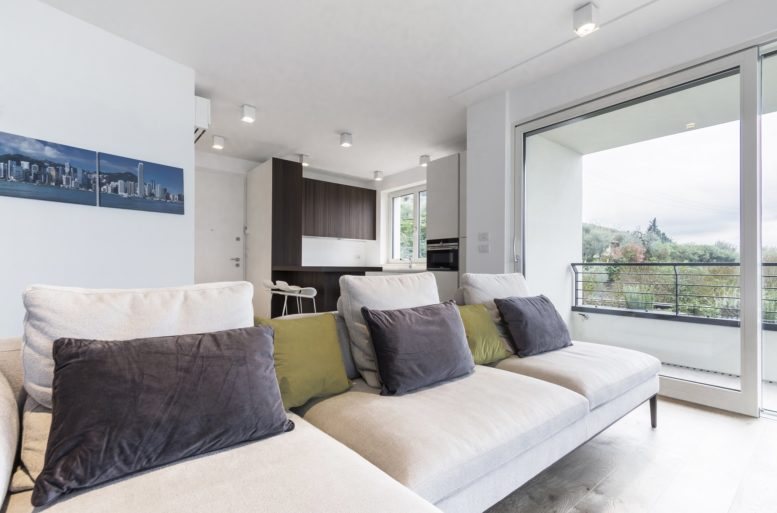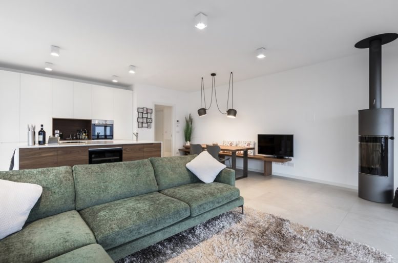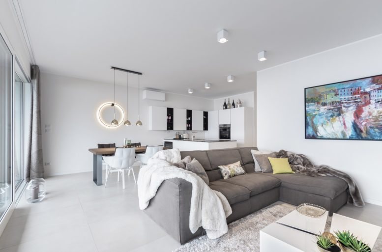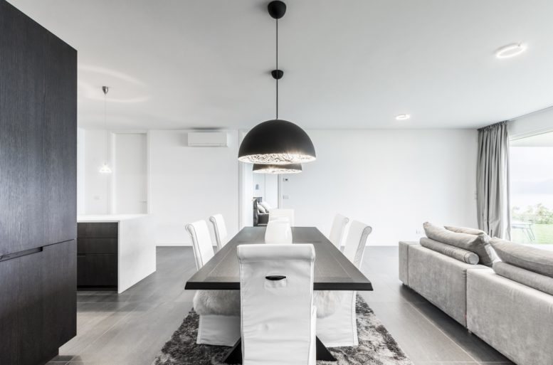 The furnishing solution, curated by Ballarini Interni, is a careful alternation of surfaces and colors on a white base. In the spacious living room, a light tone spreads uniformly, highlighted by furnishing elements, each distinguished by its specific color and material. The ash-gray sofa, the hazelnut-colored wooden dining table, and the darker wood kitchen cabinetry stand out.