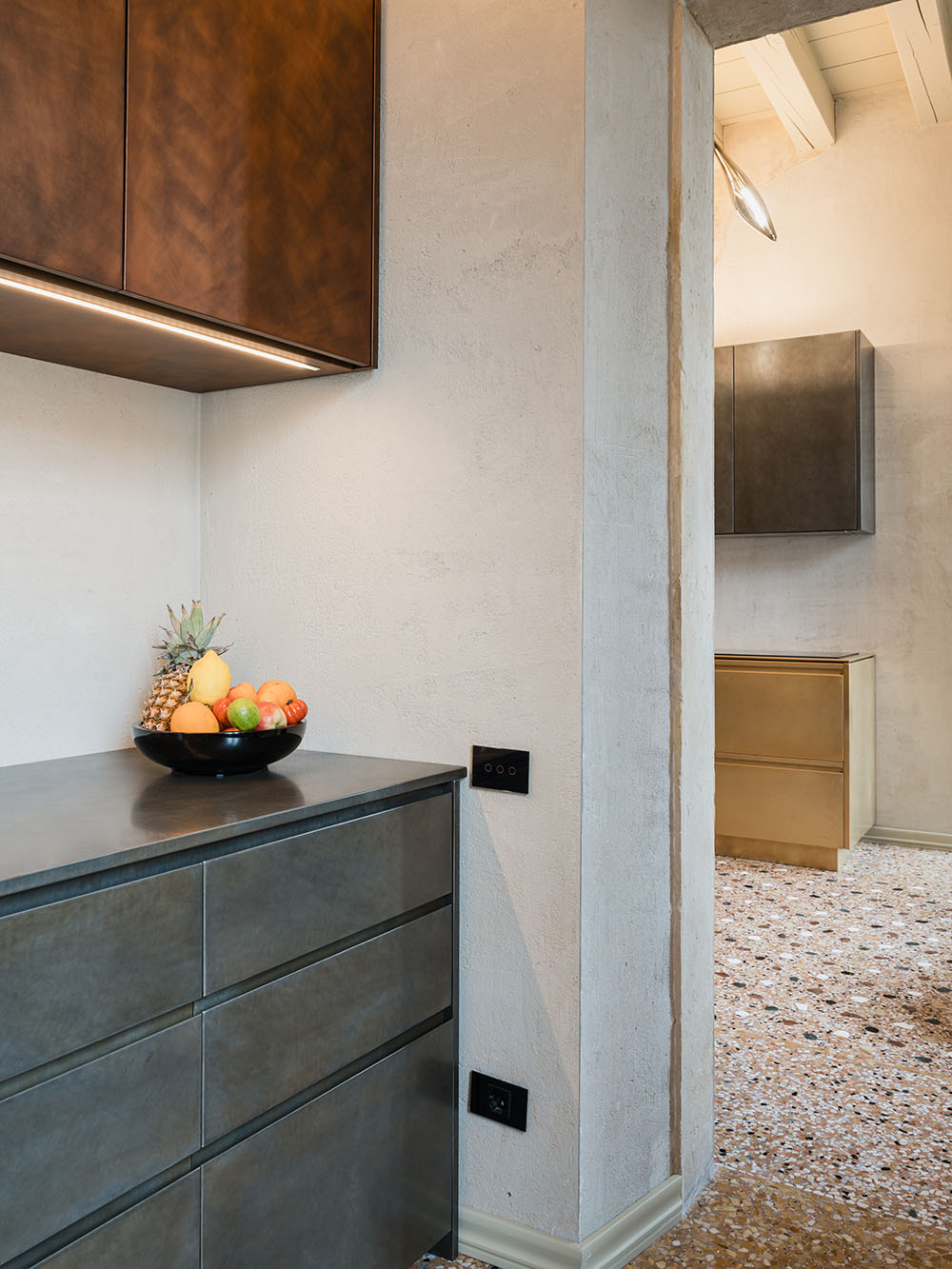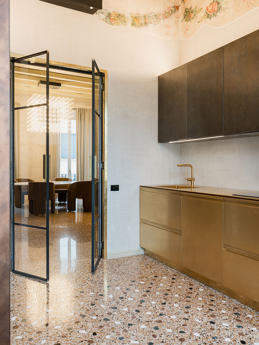 Ballarini selects Xera, featuring kitchens in steel with minimal design, characterized by precious surfaces in brass, Corian, and burnished steel, perfectly integrated with the historic materials.