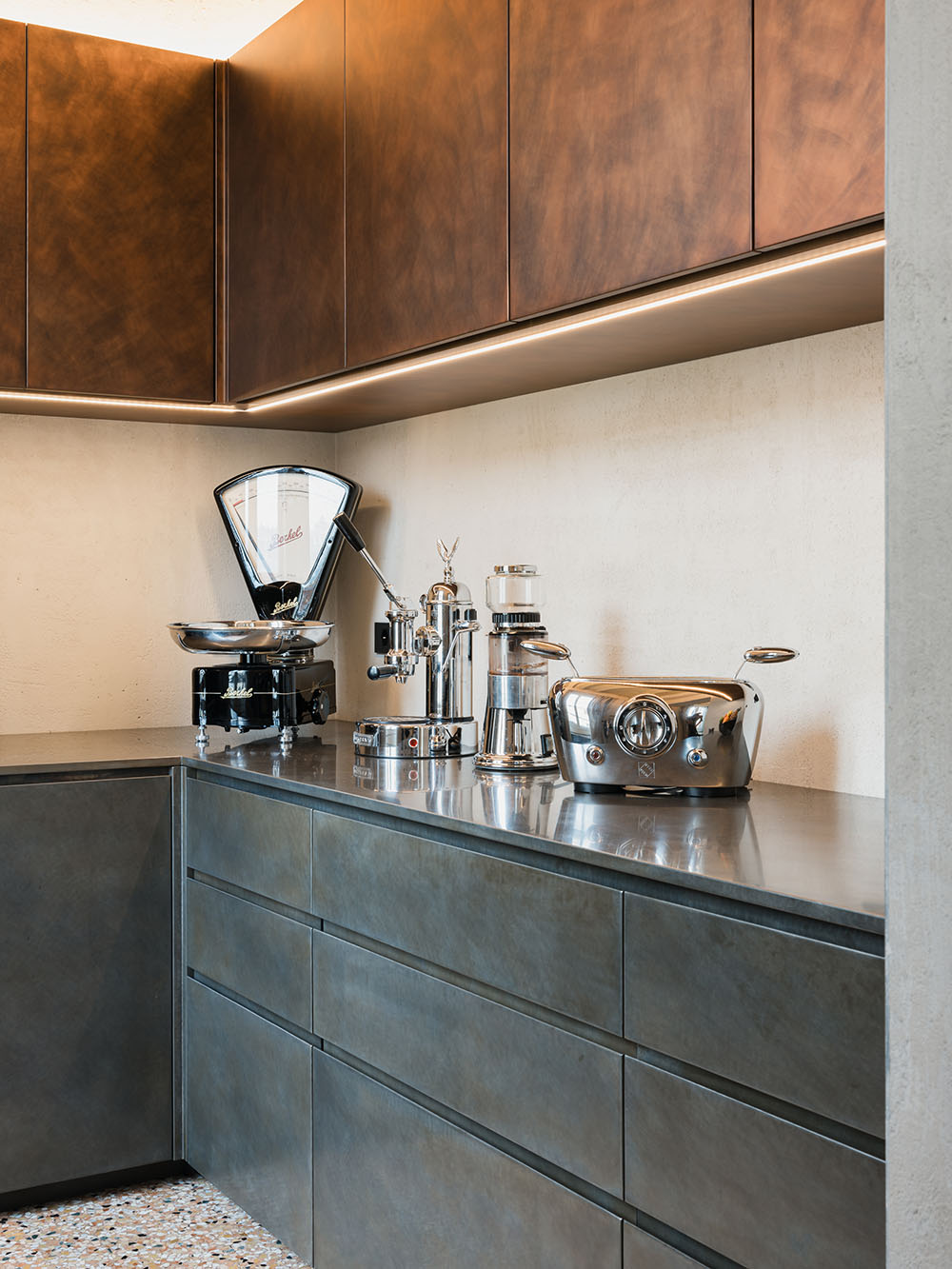 Technology is provided by Fhiaba for the refrigerator, wine cellar, and freezer, and by Neff ovens, solutions that combine innovation with understated style.