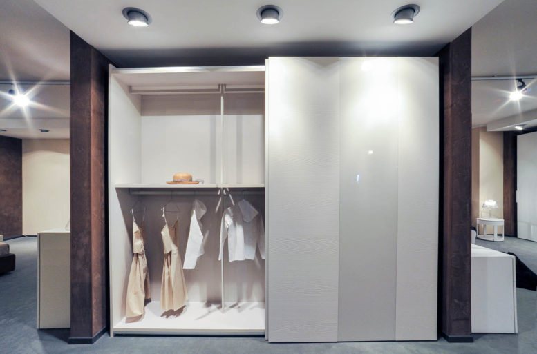 Large vertical bands decorate the doors and camouflage the distribution of the internal compartments. The sequence of finishes conveys movement to the linearity of the front. An articulated system of elements for the interior organization of wardrobes, designed to optimize storage