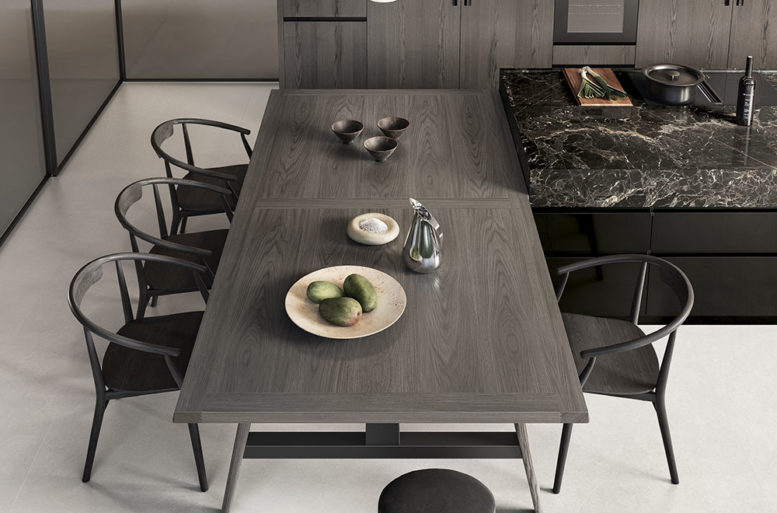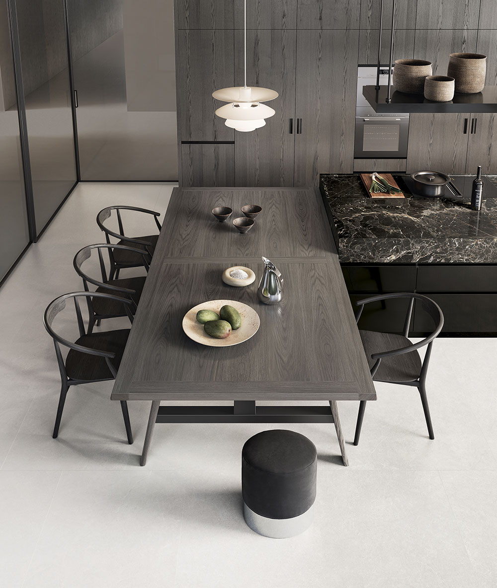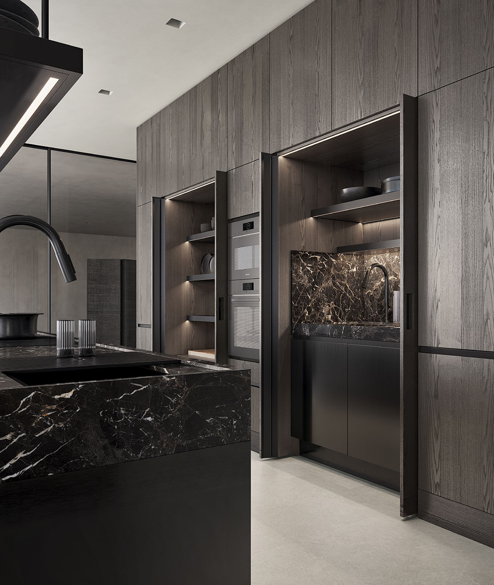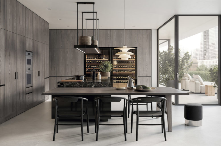 Cucinare, mangiare, vivere insieme. Protagonista del progetto la grande isola con anta Convivium Elegant in acciaio inox PVD nero, piano in marmo Noir Saint Laurent lucido e tavolo integrato Up&Down con piano Era in legno rovere grigio NTF. Nello stesso legno la boiserie perimetrale, che integra contenitori attrezzati, elementi a scomparsa del New Pocket System, la cantina refrigerata Vina, il vano e la porta Frame System, che collegano l’ambiente conviviale ad uno spazio cucina di servizio. L’isola con tavolo rituale integrato ad altezza variabile da  75 a 90 e zone operative celate dentro a spazi funzionali sono l’essenza di un concept che nel tempo si è evoluto, ma che si conferma ideale vissuto della casa, e che definisce ancora una volta la cucina quale centro della casa, crocevia della vita della famiglia, spazio nevralgico della condivisione.