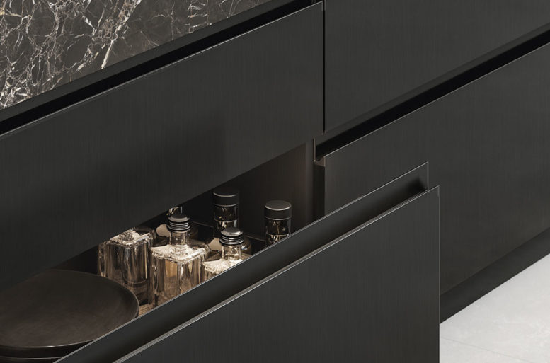Il vano New Pocket System, attrezzato a credenza, ha anta in rovere grigio NTF verticale e maniglia New Pocket PVD nero. All’interno, cestone in legno e ripiani con telaio in alluminio verniciato nero, accessori in rovere fiammato finitura moka, luce LED integrata 3000K.