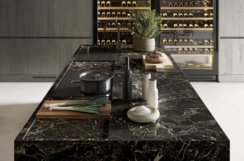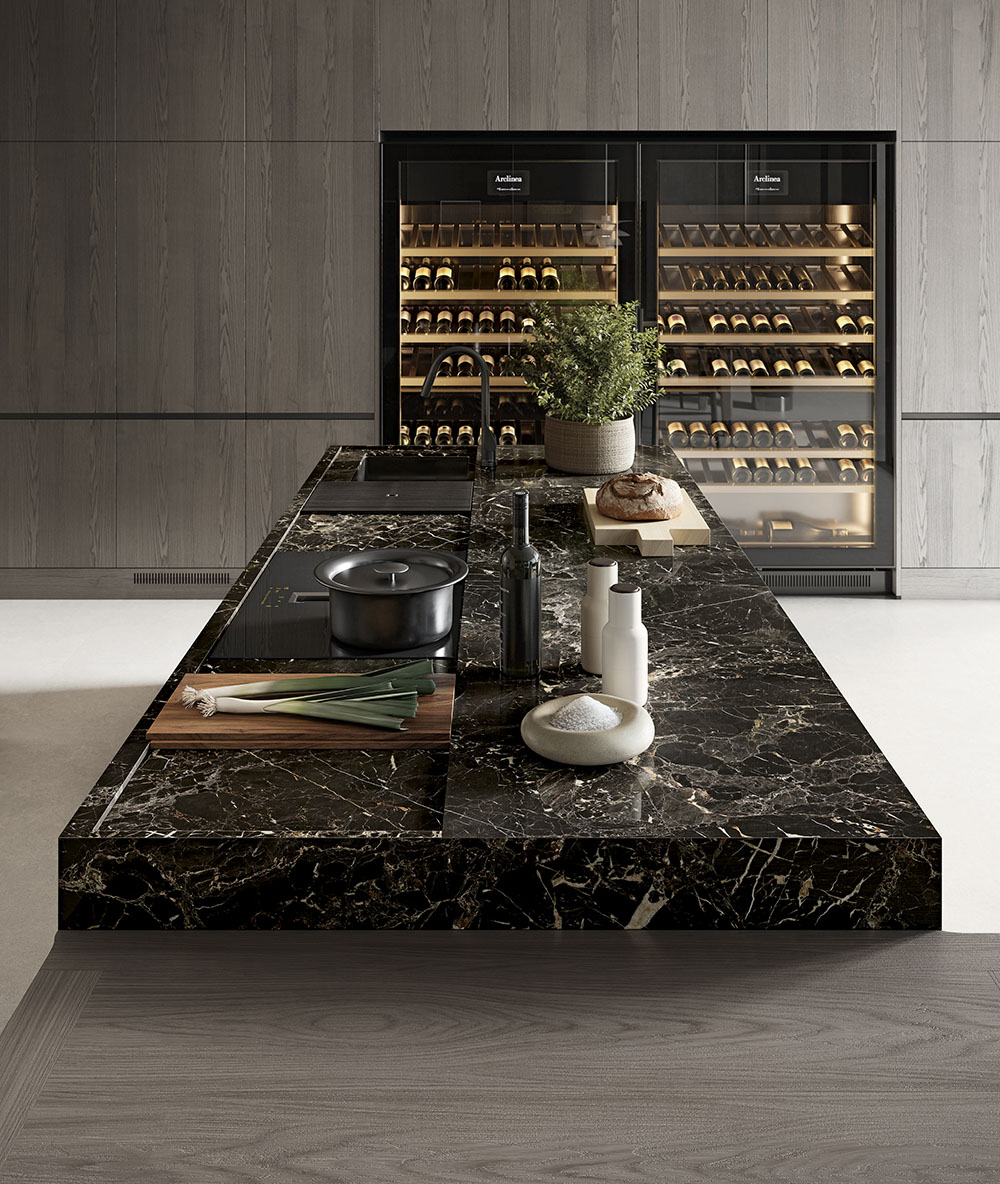 Isola operativa con piano in marmo Noir Saint Laurent nero lucido alto 20 cm, invaso su tutti i lati, che permette di preparare il cibo e usare l’acqua con più libertà: un dettaglio che trasforma la preparazione in comodità d’uso. Al centro della parete di contenimento, la cantina refrigerata Vina a doppia temperatura.