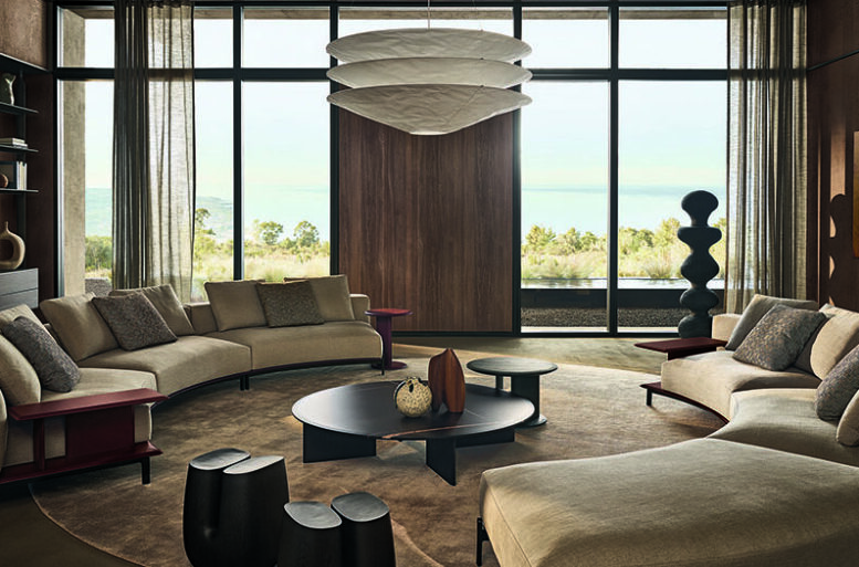 Nel secondo living, più intimo e raccolto, le linee architettoniche del divano si sposano con le curve avvolgenti delle poltrone e con complementi sofisticati, come il paravento.