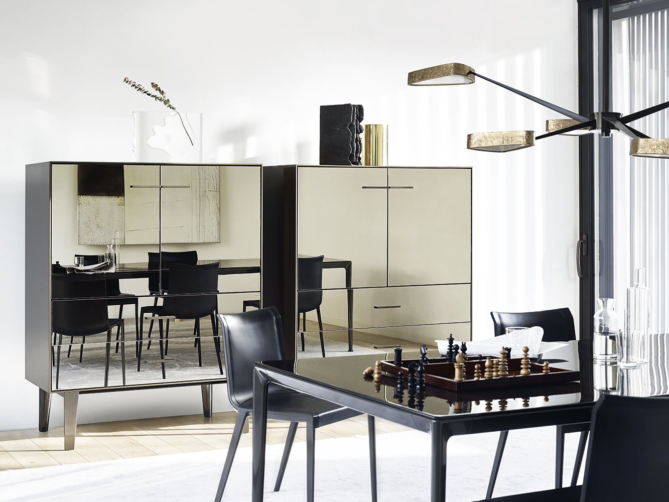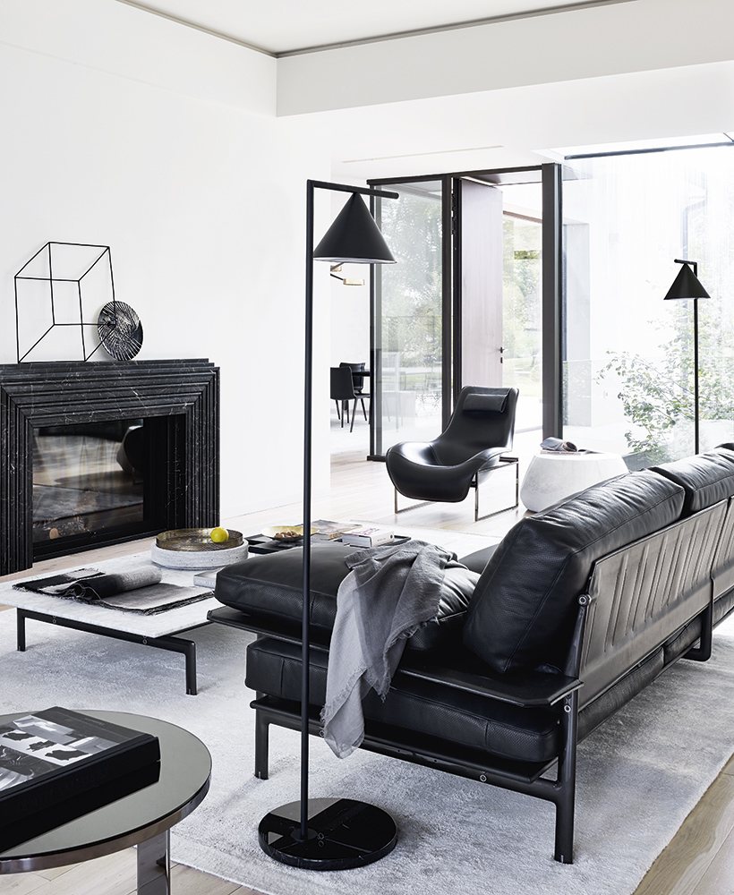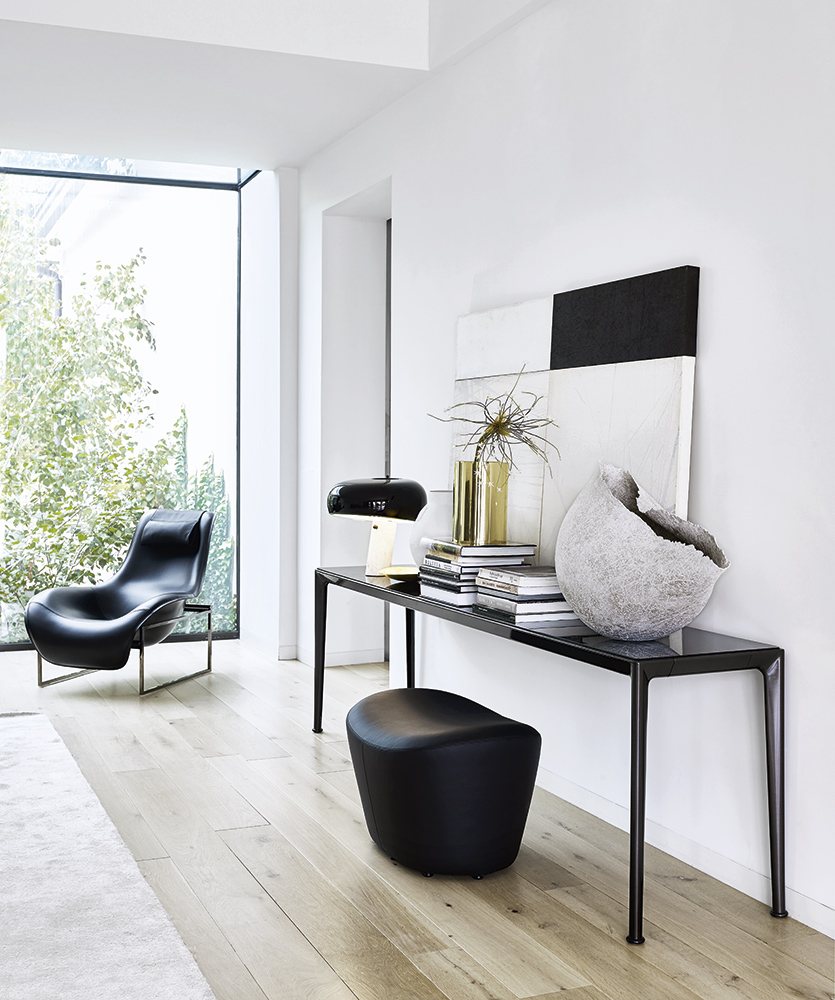 L’eleganza del nero è il principale tema della soluzione d’arredo, che alterna forme morbide e naturali, come il divano in pelle con struttura in acciaio, o il pouf e la poltrona sagomati, a forme lineari e spigolose, come la credenza specchiata della zona pranzo o il tavolino in marmo del soggiorno.