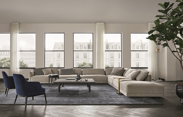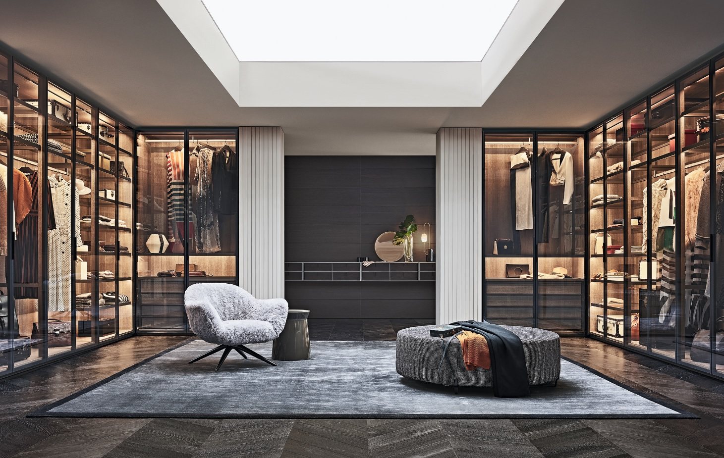 I punti chiave della casa di città proposta da Poliform sono la zona living e la cabina armadio.