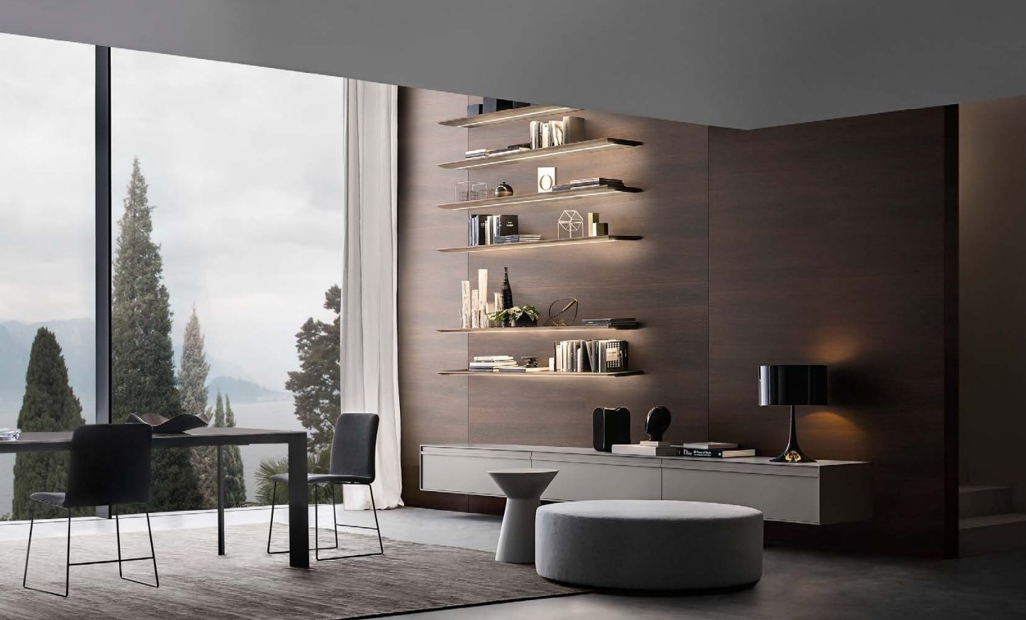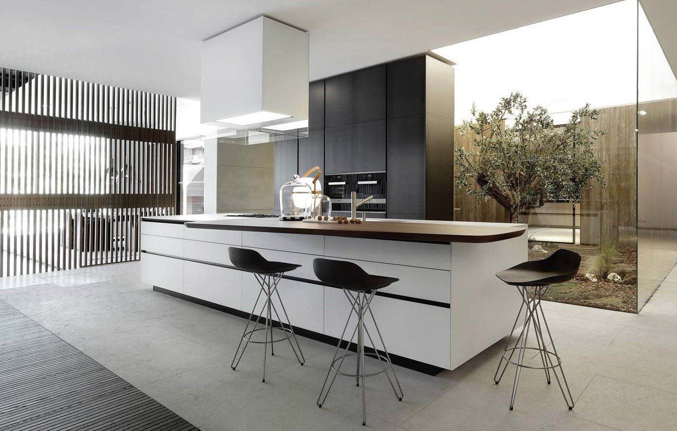 Gli spazi conviviali, come la zona giorno e le moderne cucine, sono il cuore pulsante delle ville. Materiali scuri e superfici minimaliste si alternano a tocchi caldi dati dall’illuminazione e dagli elementi in legno, creando un equilibrio tra eleganza, comfort e luce, segno distintivo della visione progettuale di O+T Architetti.