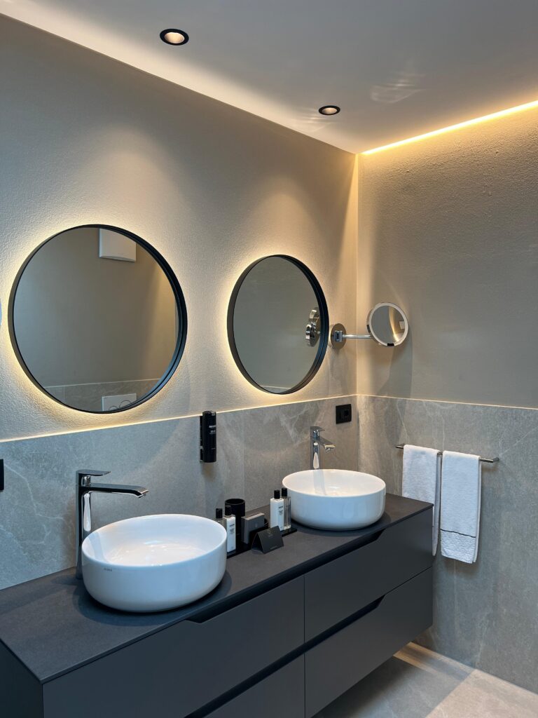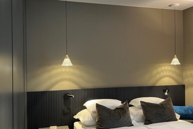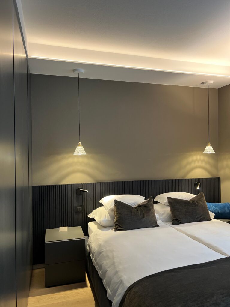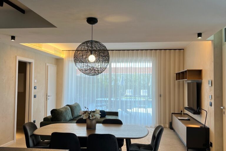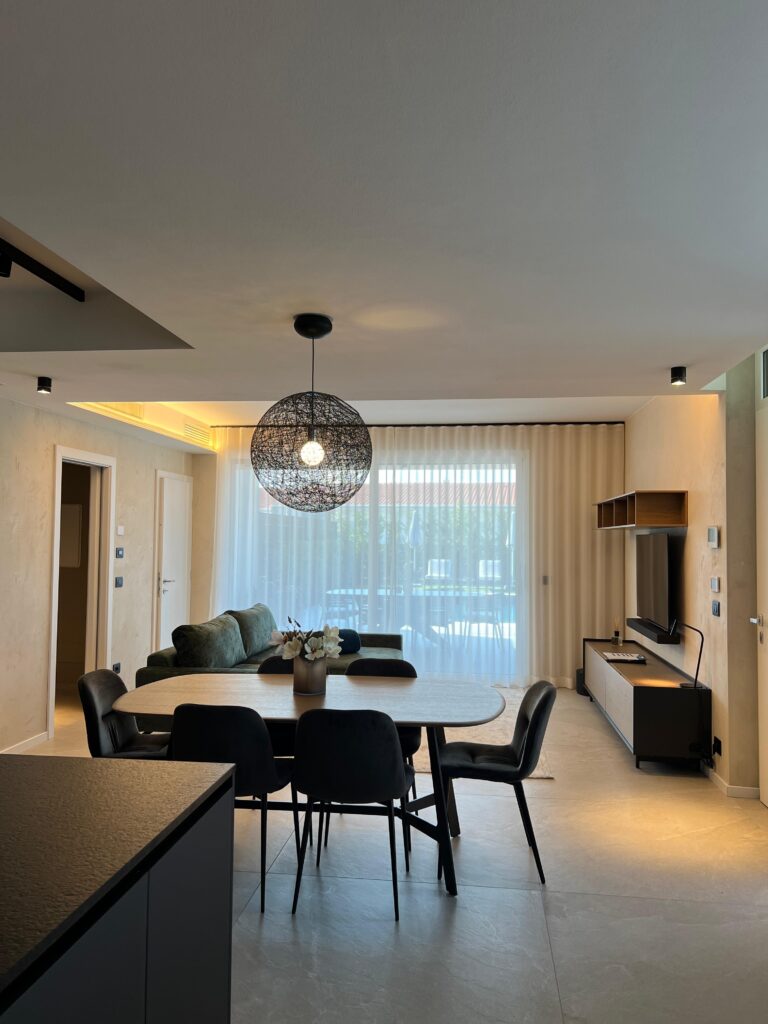 Nei diversi ambienti, si osserva l’uso sapiente di corpi illuminanti: lampade a sospensione scultoree con filamenti sulla zona pranzo e chandelier a cascata definiscono i punti focali e aggiungono profondità, assumendo un forte valore decorativo. L’illuminazione di accento e funzionale è ottenuta con strisce LED integrate in gole a soffitto, sotto i pensili della cucina o dietro mensole minimali, creando una luce d’ambiente diffusa e calda, che valorizza le texture e i volumi senza essere invadente. Infine, applique direzionali e lampade da comodino discrete offrono flessibilità e comfort visivo, consentendo agli ospiti di personalizzare l’esperienza di luce.