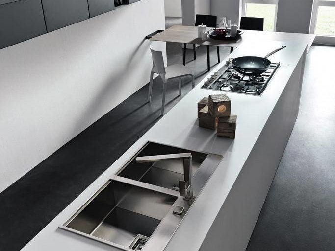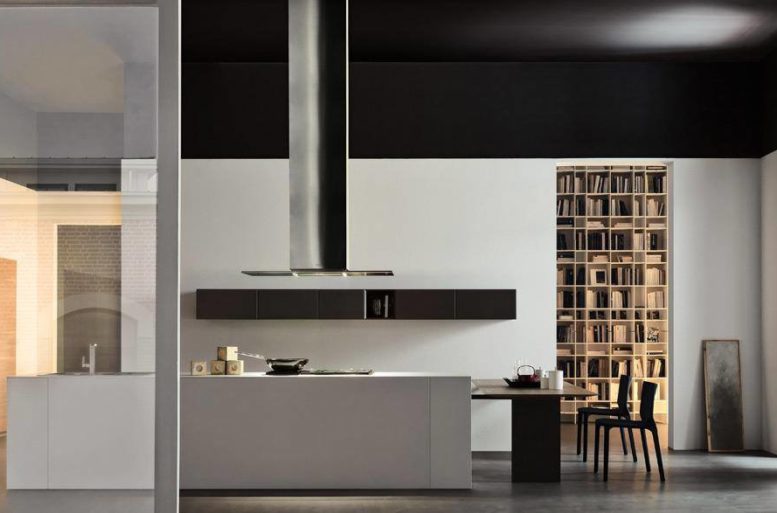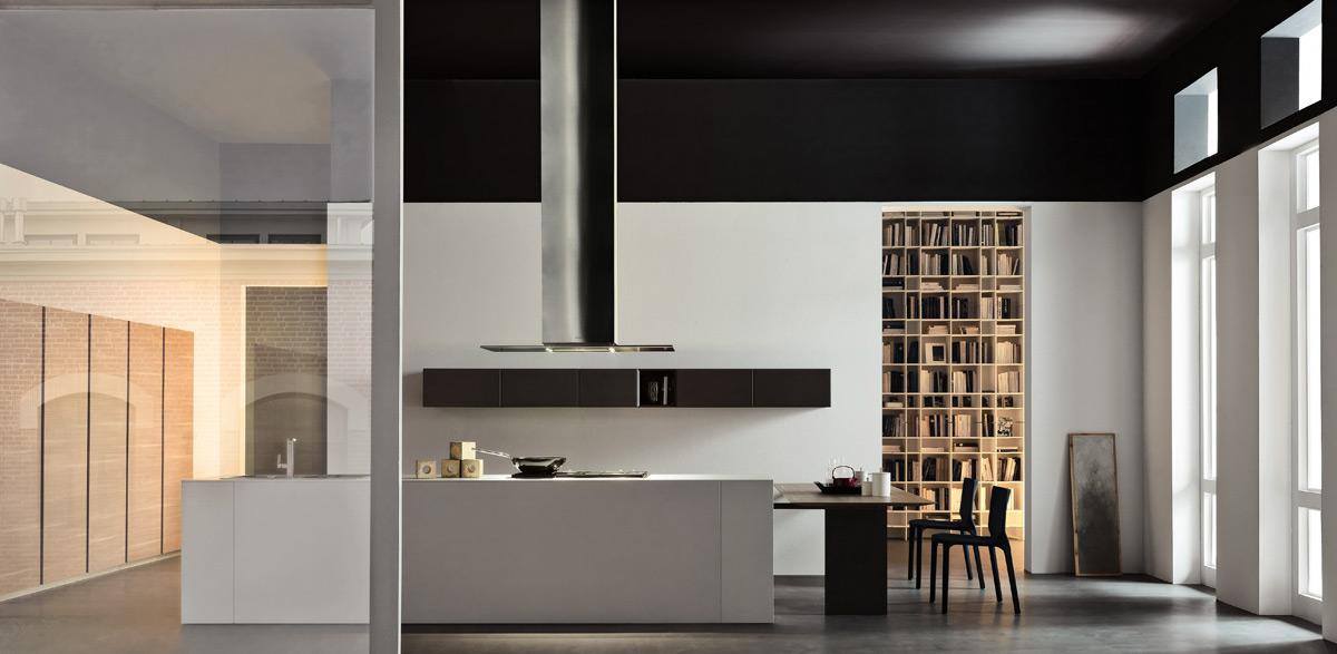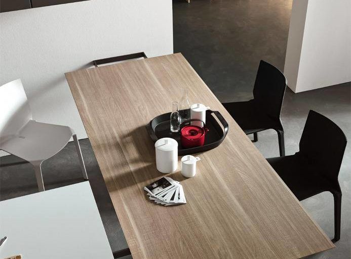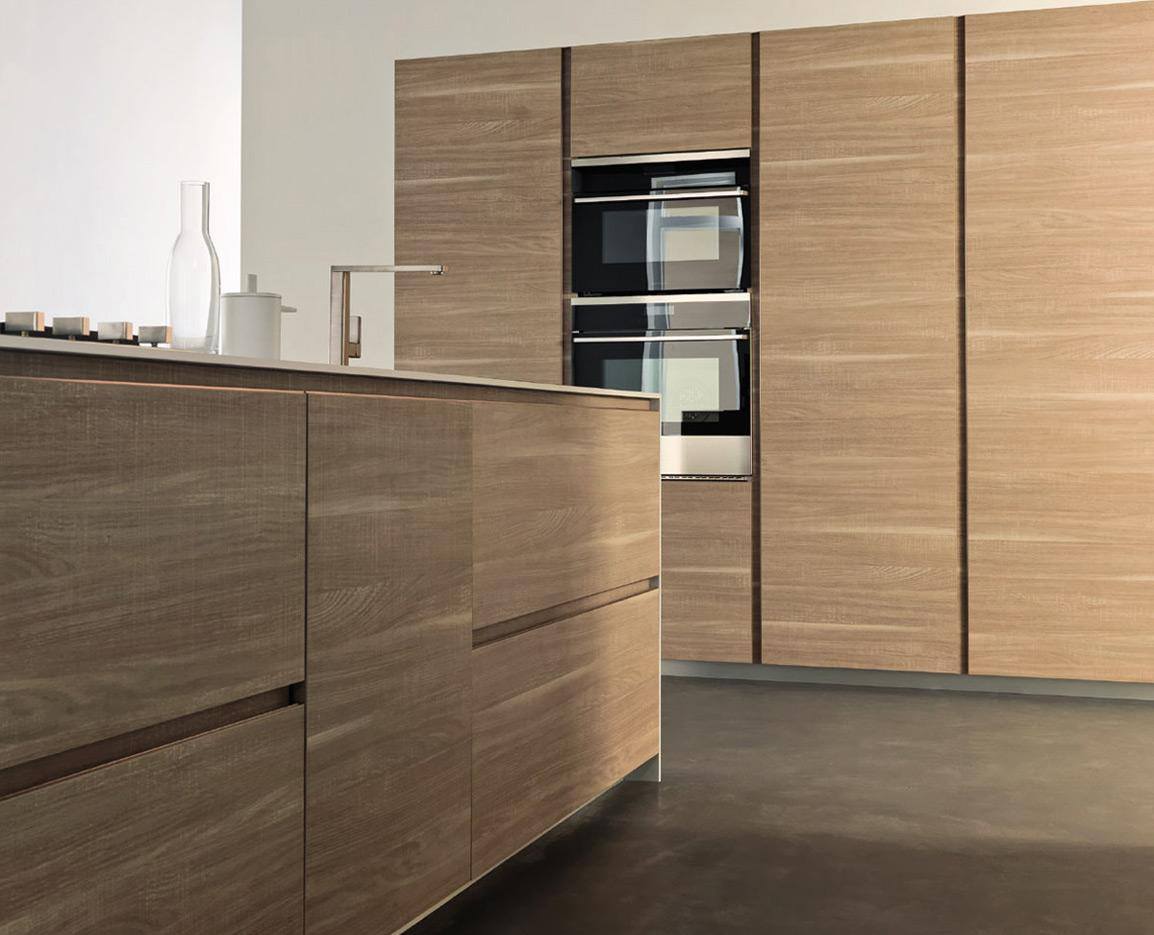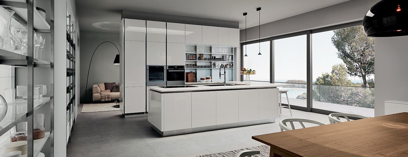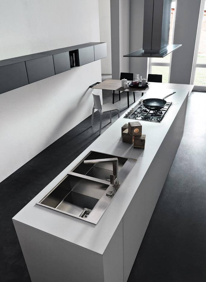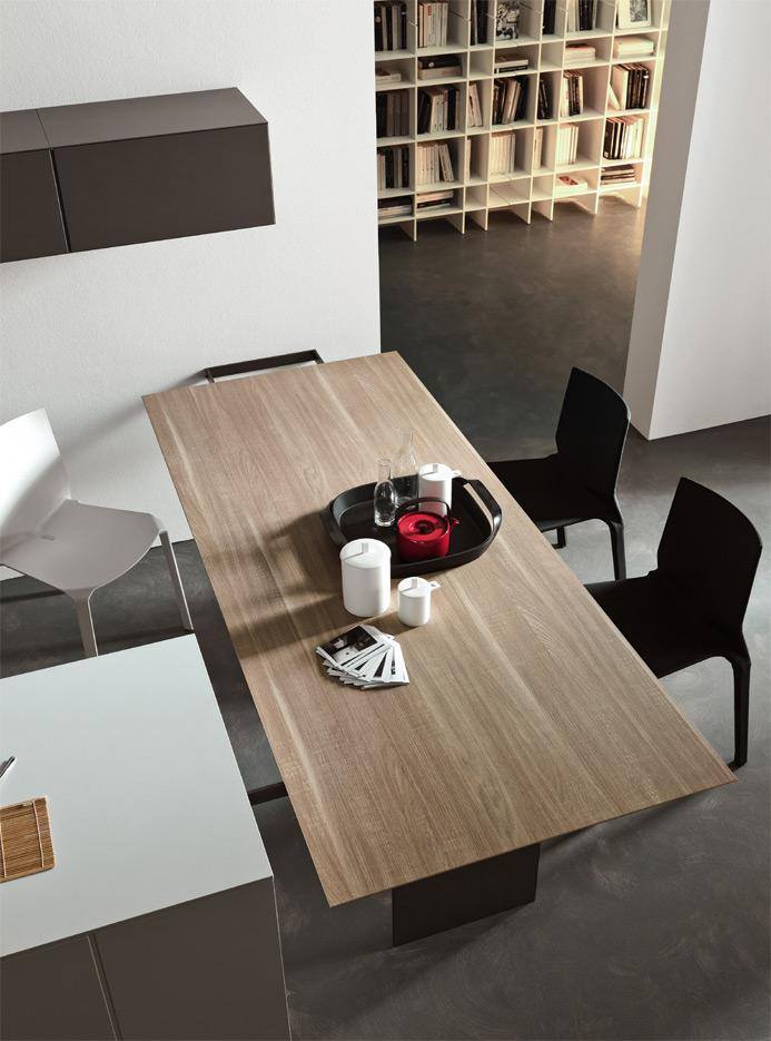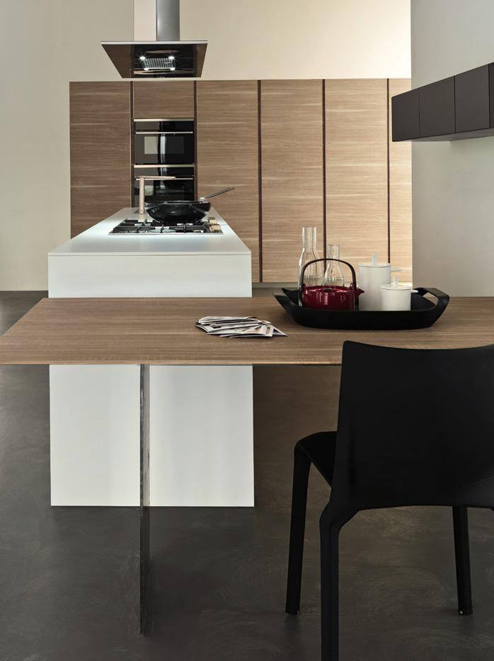 L’ architettura di questa cucine Modulnova è costituita da linee e forme semplificate e lascia all’utente finale la possibilità di personalizzare l’ambiente rendendo la composizione assolutamente unica. Le colonne sospese sono combinate con basi penisola di Rovere collegata ad un tavolo per il pranzo e la colazione di tutti i giorni.