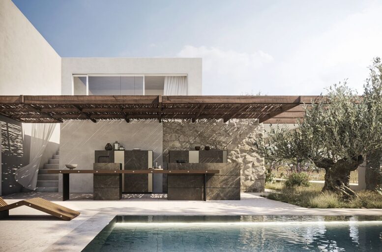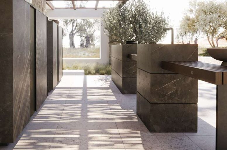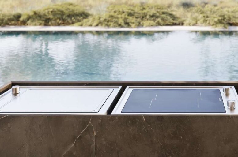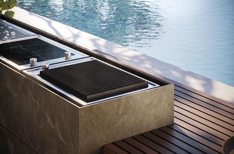 Nel Project 1, risaltano gli speciali i blocchi cottura e lavaggio del sistema Block a tre doghe in gres Gold Brown, le cui superfici rimandano alla pietra naturale. Il sistema Block definisce blocco lavabo dotato di vasca per il lavaggio e miscelatore abbattibile. Il blocco cottura è completato dal piano cottura Mate in appoggio, indicato per le soluzioni outdoor perché resistente agli agenti atmosferici, all’umidità e alla salsedine. Anche questa dotazione tecnica è customizzabile: i piani cottura freestanding Mate, elettrici o a gas, in acciaio AISI 316, infatti, sono facilmente amovibili, intercambiabili e posizionabili con la massima libertà. Inoltre, è possibile completare il piano cottura con l’equipaggiamento più adatto a soddisfare le proprie aspirazioni o esigenze tecniche, inserendo per esempio piastre a induzione, piastre teppanyaki o una griglia per il barbecue.