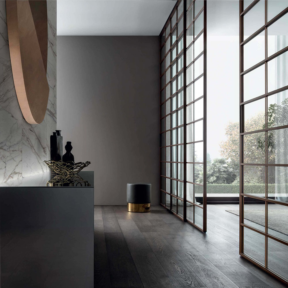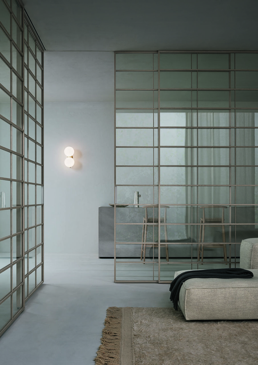 Soho è un sistema di porte scorrevoli, dove leggerezza, e trasparenza si fondono con la capacità di dividere e unire al contempo.