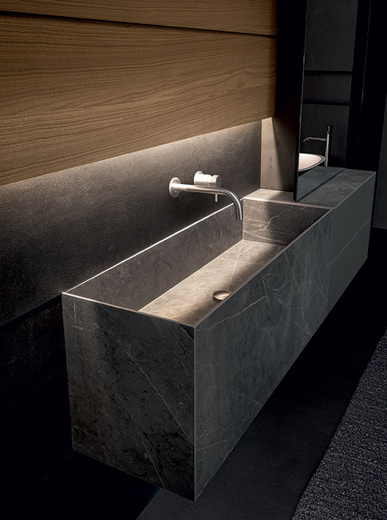 Il grande blocco a terra in Pietra Piasentina, con lavabo integrato, si distingue per la lavorazione millerighe che disegna una texture sofisticata e materica, esaltandone il valore estetico e tattile. Modulnova offre la possibilità di progettare a casa il proprio spazio Wellness, combinando soluzioni scenografiche e tecnologie all’avanguardia.