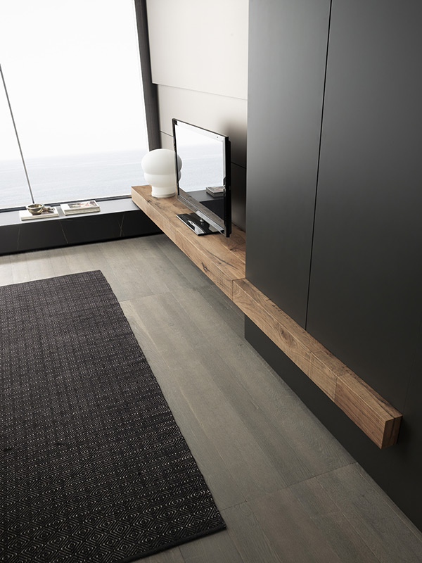 Il sistema Blade è caratterizzato da soluzioni tecniche avanzate e una progettazione innovativa. Le ante, spesse 1 cm, sono realizzate con un pannello alveolare in alluminio, rivestito su entrambi i lati con alluminio e trattato con finiture pregiate. Il sistema prevede un’alternanza tra porte battenti, con apertura push-pull, e moduli sporgenti di 15 cm, che permettono di creare nicchie funzionali tra le colonne. Queste nicchie possono essere rivestite con fianchi e schienali nelle finiture a scelta, come resina o legno, e possono essere dotate di illuminazione LED dimmerabile. Inoltre, il programma Blade include colonne con ante sporgenti di 15 cm che possono essere utilizzate per creare setti separatori, dove è possibile inserire una libreria monofacciale della collezione Unlimited o altre soluzioni funzionali, come ad esempio, basi con montanti in ferro e finiture melaminiche.