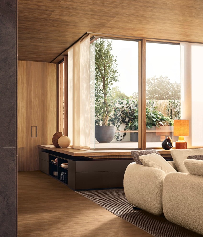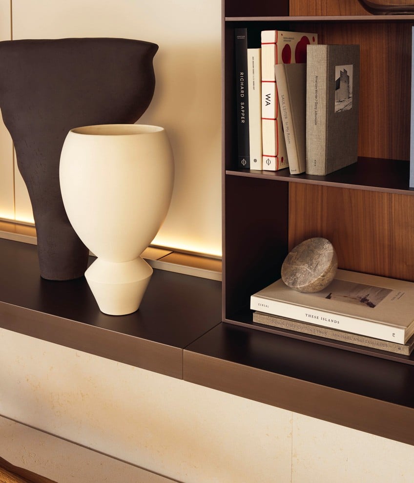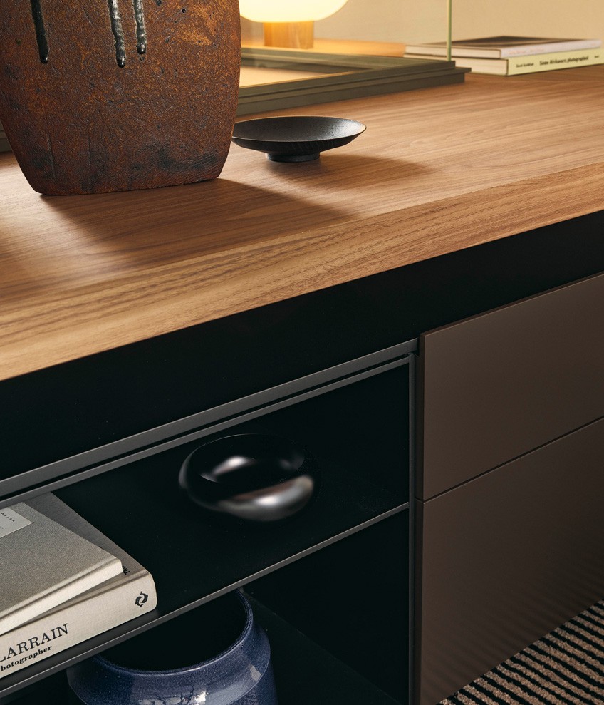 A completamento del sistema, una selezione di madie permette infinite configurazioni, con la possibilità di scegliere tra vani a giorno, vetrine, cassetti, ante battenti o a ribalta. La versatilità di Code si manifesta anche nella ricca varietà di finiture, che possono essere personalizzate in ogni dettaglio, fino al singolo componente.