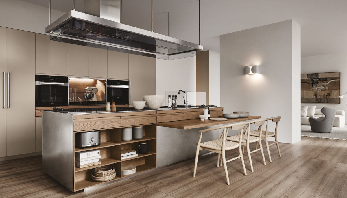 Convivium arreda le pareti di un ambiente che diventa caldo, accogliente e funzionale, con un’isola-tavolo al centro e mensole a cappotta che percorrono l’intero perimetro della stanza, all’altezza di una cornice da quadro.