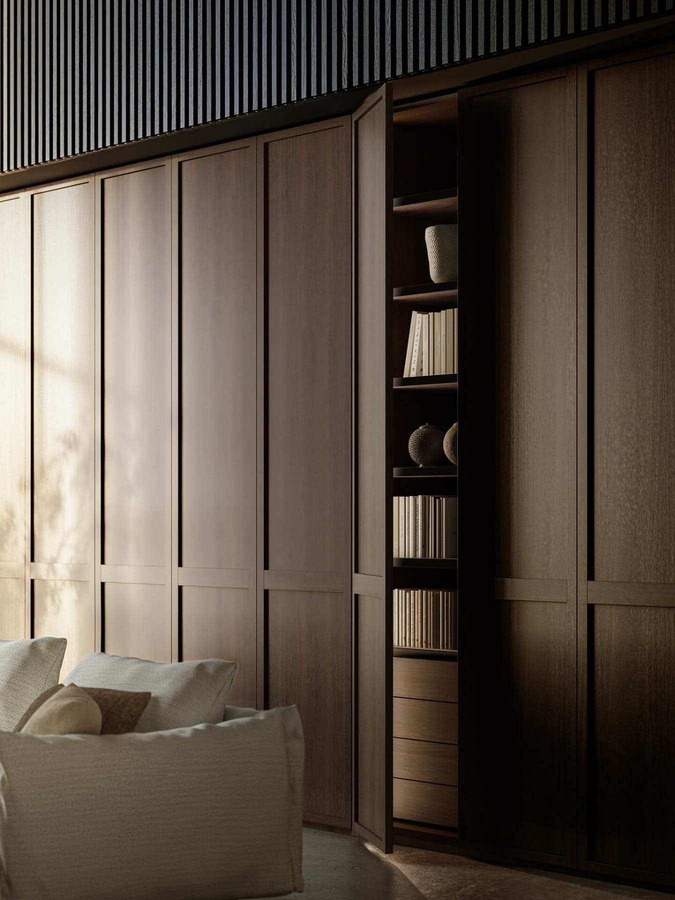 Funzionalità e rigore estetico si incontrano nell’Armadio al Centimetro Domo, firmato da Piero Lissoni. Il suo elemento distintivo è l’anta a telaio battente, dove, come in un’illusione, il telaio orizzontale cela una maniglia a gola, un dettaglio in due dimensioni che si svela solo da vicino. Domo reinterpreta in chiave contemporanea le linee definite dallo stile classico, dando vita a un prodotto versatile, capace di adattarsi a diversi contesti e di arredare con eleganza sia le zone notte sia quelle giorno.